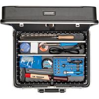 GEREEDSCHAPKOFFER ELEKTRICIEN 90-delig. De perfecte set voor een elektromonteur, maar ook voor bijvoorbeeld een huismeester. Praktijkgericht samengesteld sortiment, voor gebruik op locatie. Opgeborgen in een stabiele, slagvaste kunststof koffer. Voorzien van een aluminium raamwerk met geïntegreerde verzonken sloten. De koffer is bovendien voorzien van drie stevige metalen scharnieren, twee metalen dekselhouders en een comfortabele handgreep. GEDORE-Vanadium gereedschappen, verchroomd. Afmetingen: B 480 x D 370 x H 180 mm.