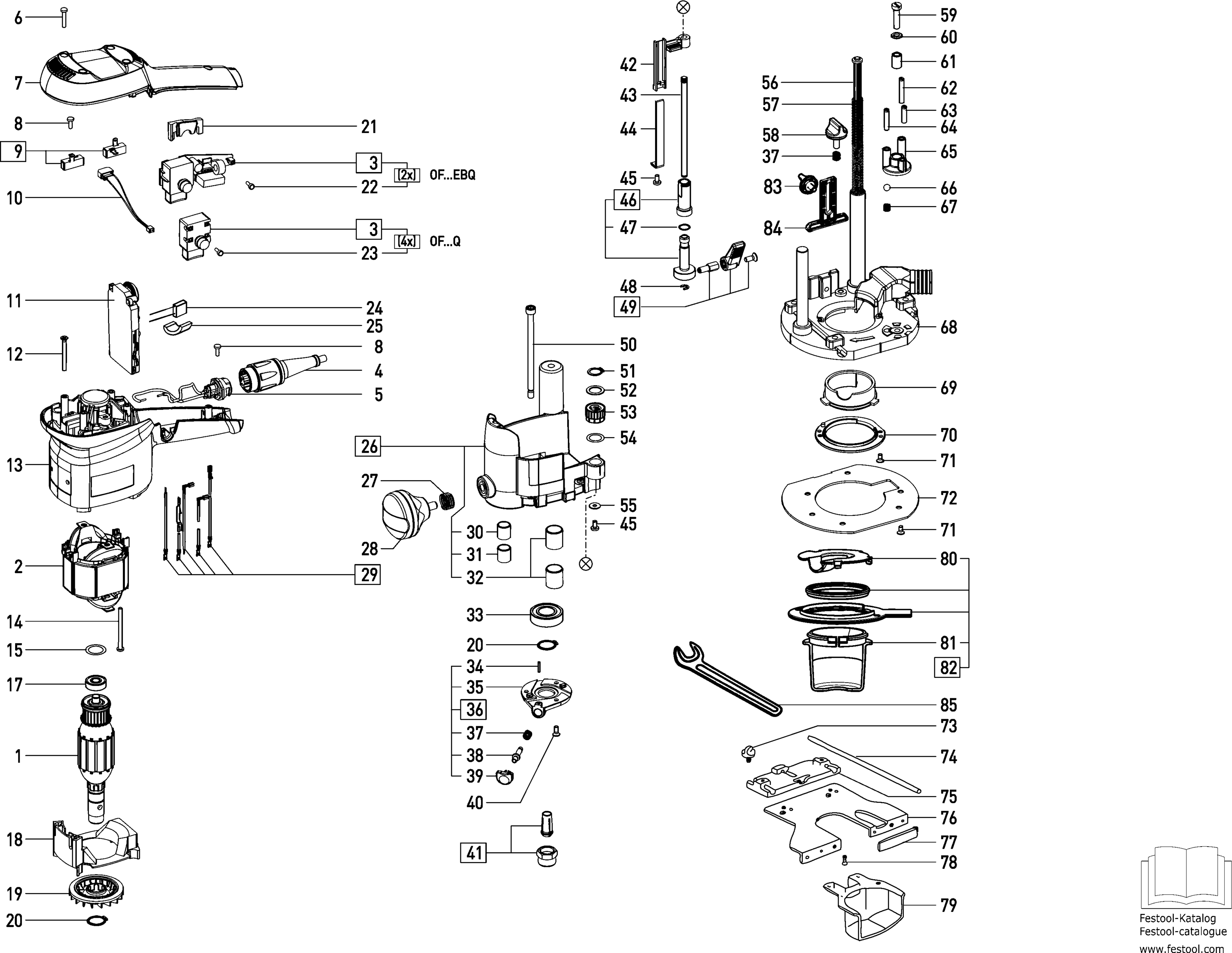 Hier vindt u alle beschikbare onderdelen en tekeningen van de 'Festool 490108 ( OF1010Q )'. Vanaf hier kunt u direct alle gewenste onderdelen bestellen. Vele onderdelen moeten bij de fabrikant besteld worden, dit duurt afhankelijk van het merk, één tot vier weken. Alle informatie die we hebben, staat op onze website, wij kunnen u geen advies geven over wat u nodig heeft, daarvoor zult u de machine ter reparatie in moeten leveren. Let bij het bestellen op het volgende: