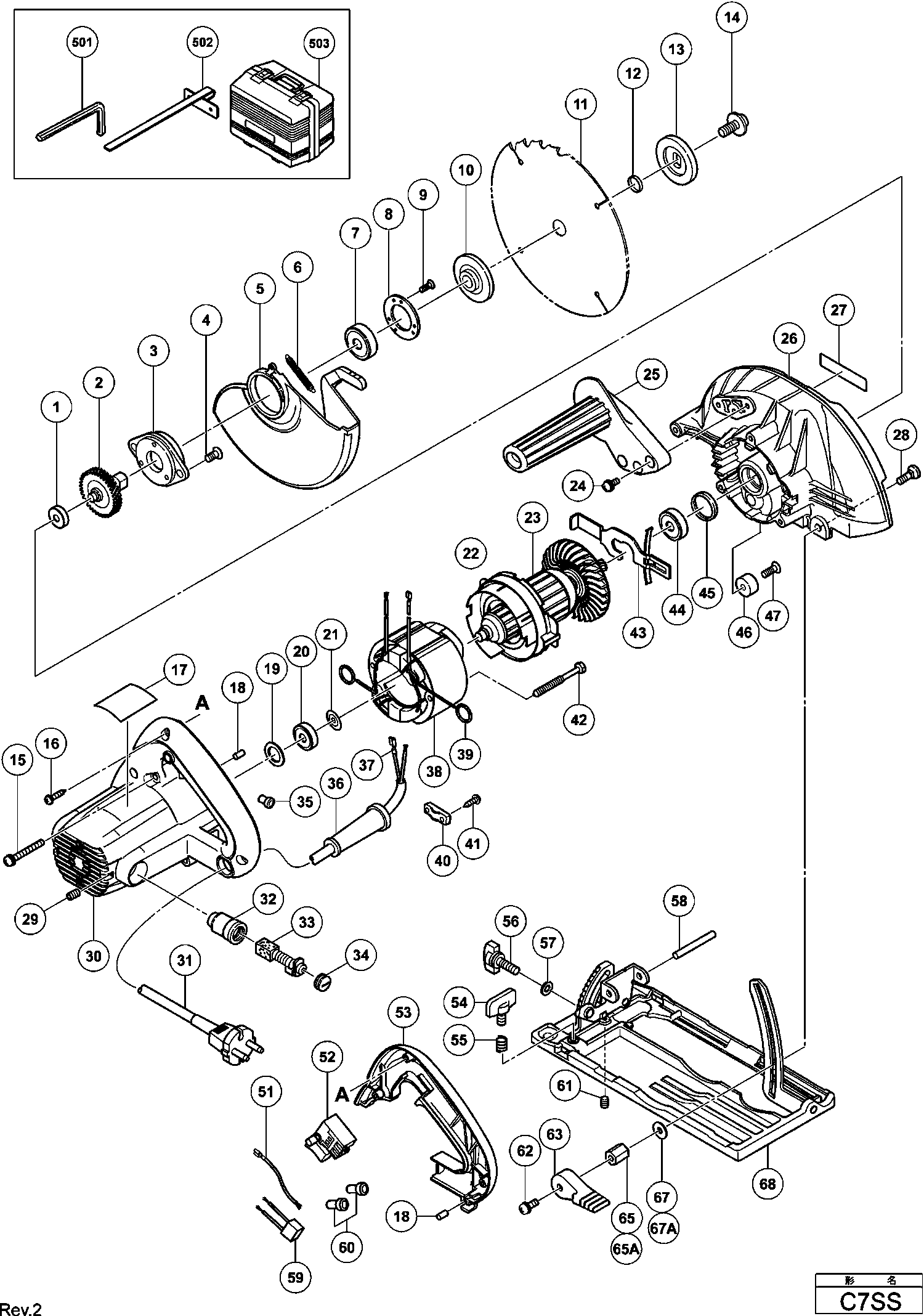 Hier vindt u alle beschikbare onderdelen en tekeningen van de 'Hikoki C7SS'. Vanaf hier kunt u direct alle gewenste onderdelen bestellen. Vele onderdelen moeten bij de fabrikant besteld worden, dit duurt afhankelijk van het merk, één tot vier weken. Alle informatie die we hebben, staat op onze website, wij kunnen u geen advies geven over wat u nodig heeft, daarvoor zult u de machine ter reparatie in moeten leveren. Let bij het bestellen op het volgende: