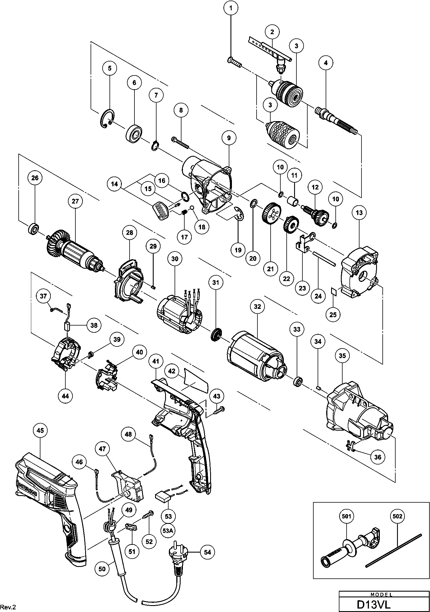 Onderdelen lijst van de Hikoki D13VL