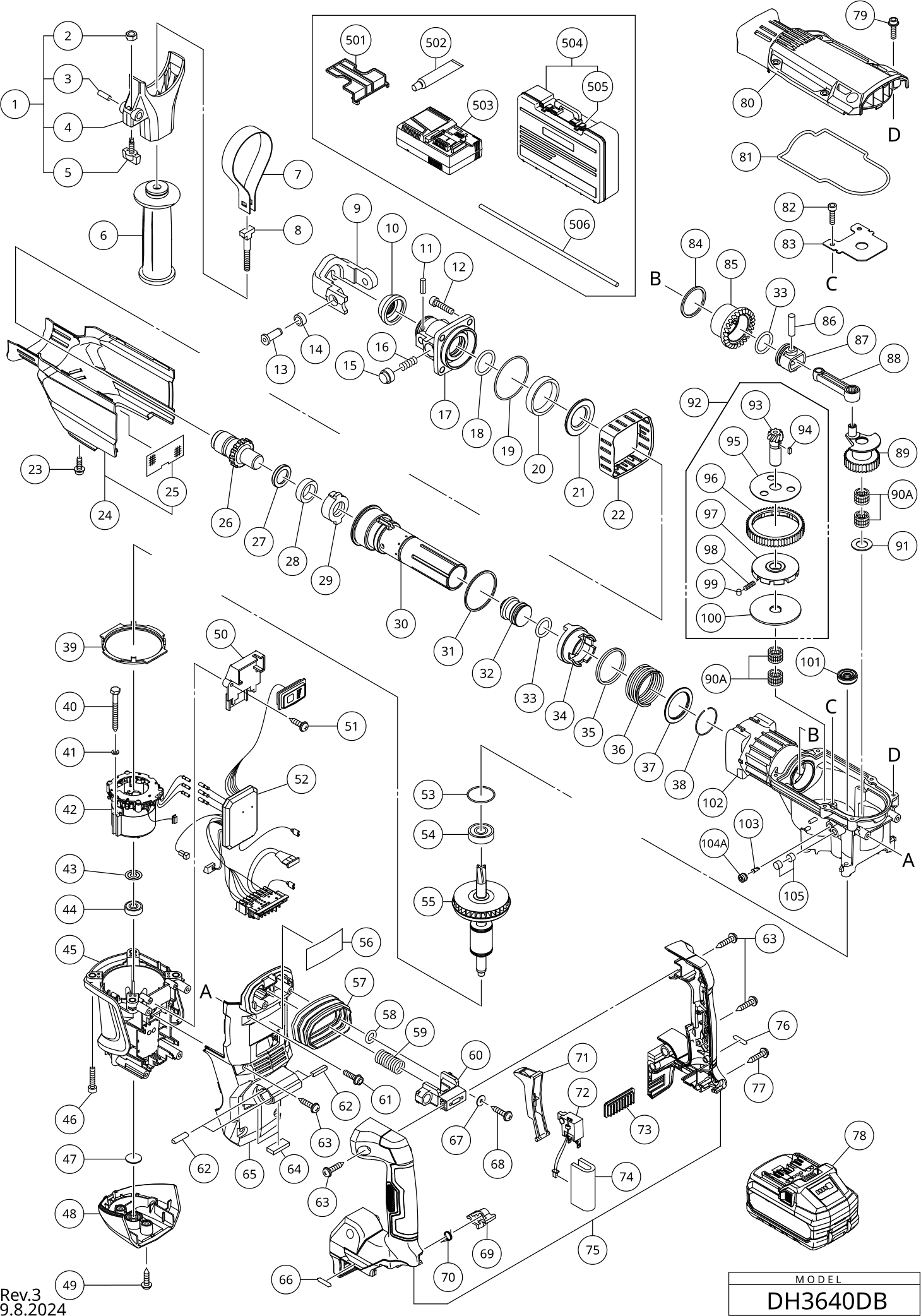 Hier vindt u alle beschikbare onderdelen en tekeningen van de 'Hikoki DH3640DB'. Vanaf hier kunt u direct alle gewenste onderdelen bestellen. Vele onderdelen moeten bij de fabrikant besteld worden, dit duurt afhankelijk van het merk, één tot vier weken. Alle informatie die we hebben, staat op onze website, wij kunnen u geen advies geven over wat u nodig heeft, daarvoor zult u de machine ter reparatie in moeten leveren. Let bij het bestellen op het volgende: