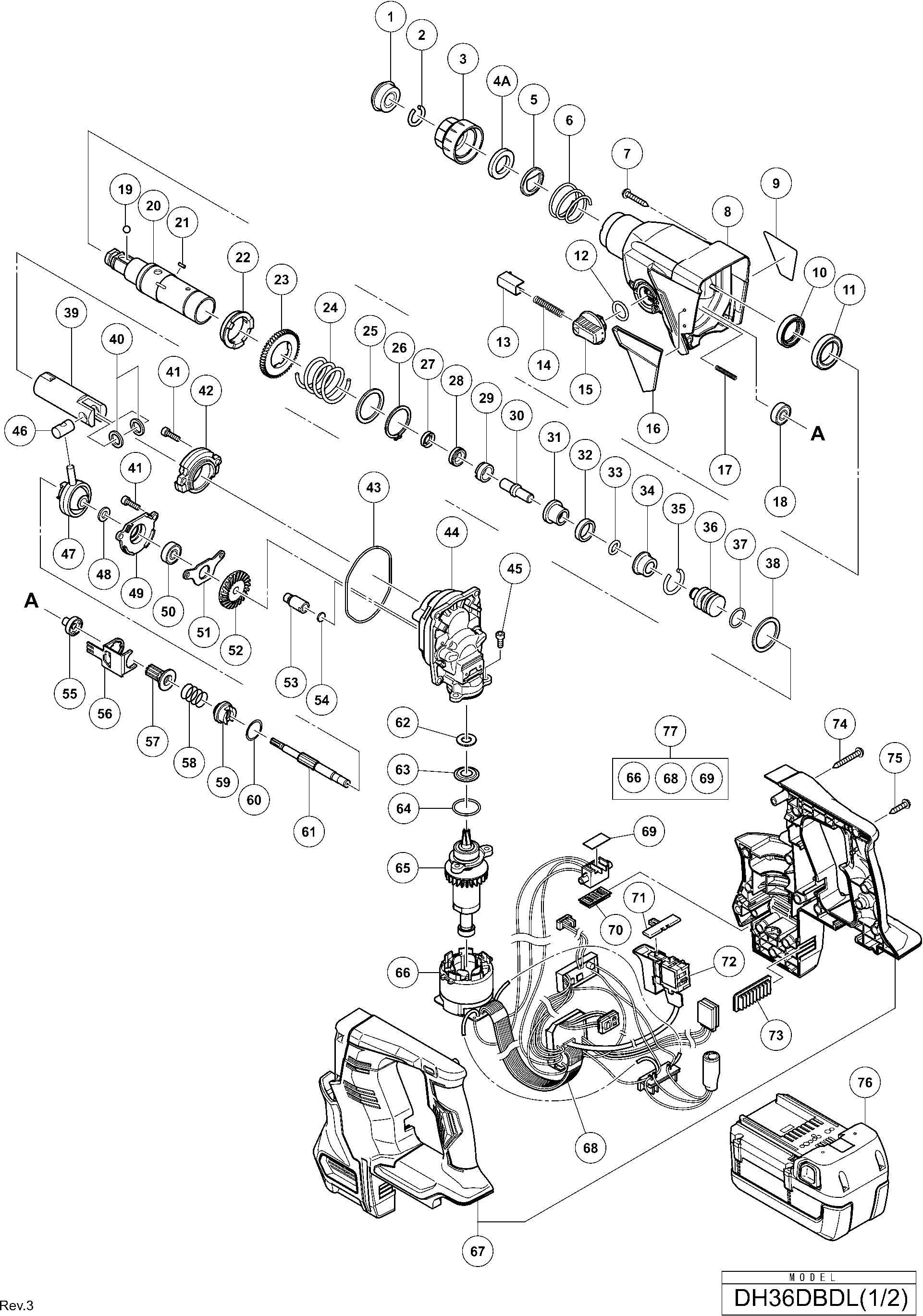 Onderdelen lijst van de Hikoki DH36DBDL