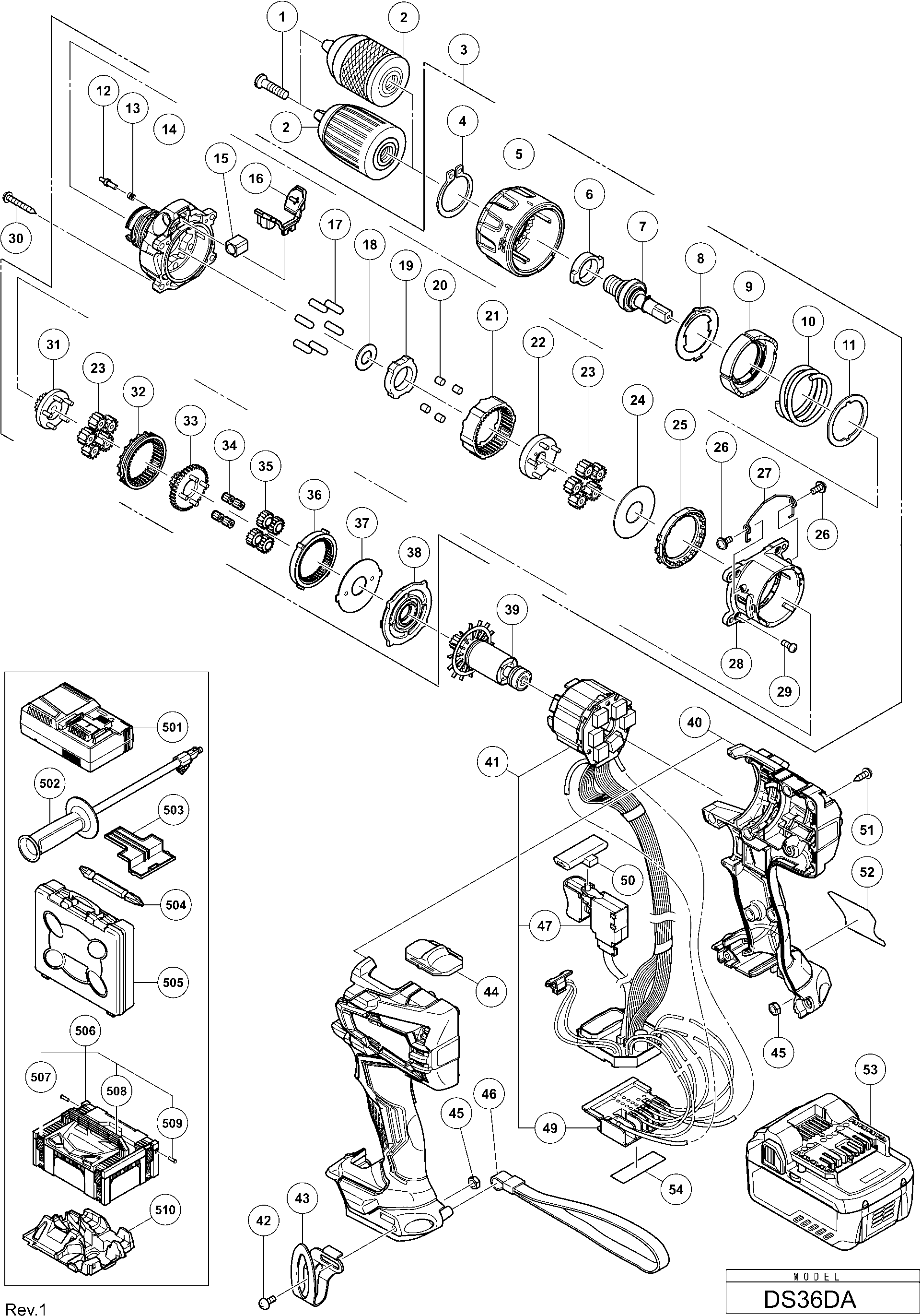 Hier vindt u alle beschikbare onderdelen en tekeningen van de 'Hikoki DS36DA'. Vanaf hier kunt u direct alle gewenste onderdelen bestellen. Vele onderdelen moeten bij de fabrikant besteld worden, dit duurt afhankelijk van het merk, één tot vier weken. Alle informatie die we hebben, staat op onze website, wij kunnen u geen advies geven over wat u nodig heeft, daarvoor zult u de machine ter reparatie in moeten leveren. Let bij het bestellen op het volgende: