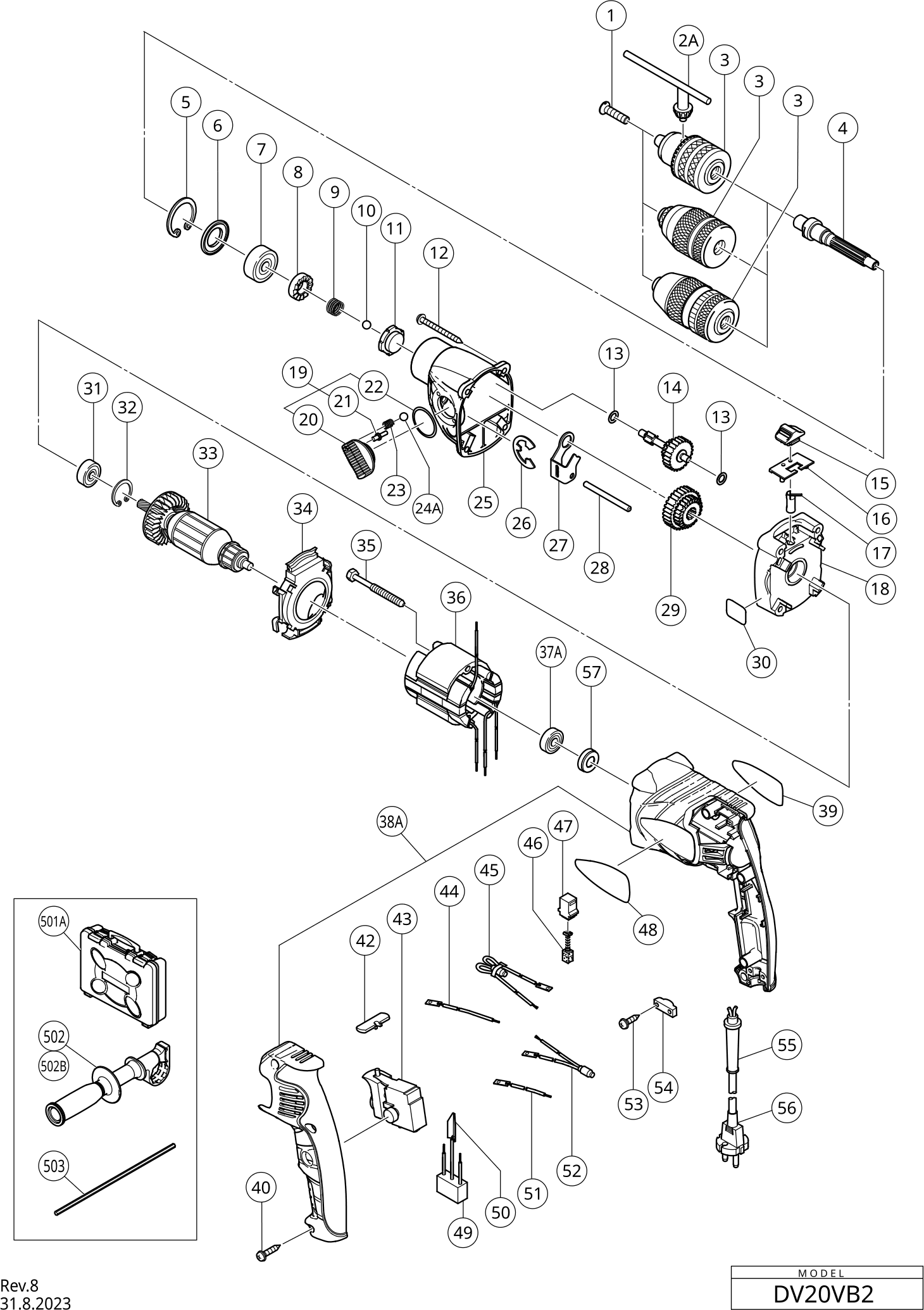 Hier vindt u alle beschikbare onderdelen en tekeningen van de 'Hikoki DV20VB2'. Vanaf hier kunt u direct alle gewenste onderdelen bestellen. Vele onderdelen moeten bij de fabrikant besteld worden, dit duurt afhankelijk van het merk, één tot vier weken. Alle informatie die we hebben, staat op onze website, wij kunnen u geen advies geven over wat u nodig heeft, daarvoor zult u de machine ter reparatie in moeten leveren. Let bij het bestellen op het volgende: