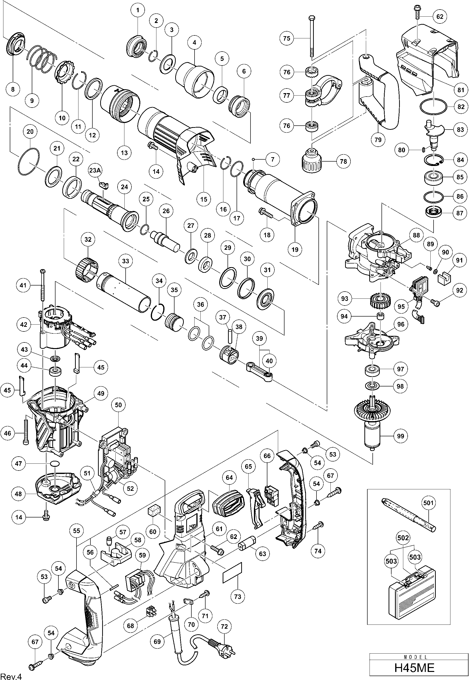 Hier vindt u alle beschikbare onderdelen en tekeningen van de 'Hikoki H45ME'. Vanaf hier kunt u direct alle gewenste onderdelen bestellen. Vele onderdelen moeten bij de fabrikant besteld worden, dit duurt afhankelijk van het merk, één tot vier weken. Alle informatie die we hebben, staat op onze website, wij kunnen u geen advies geven over wat u nodig heeft, daarvoor zult u de machine ter reparatie in moeten leveren. Let bij het bestellen op het volgende: