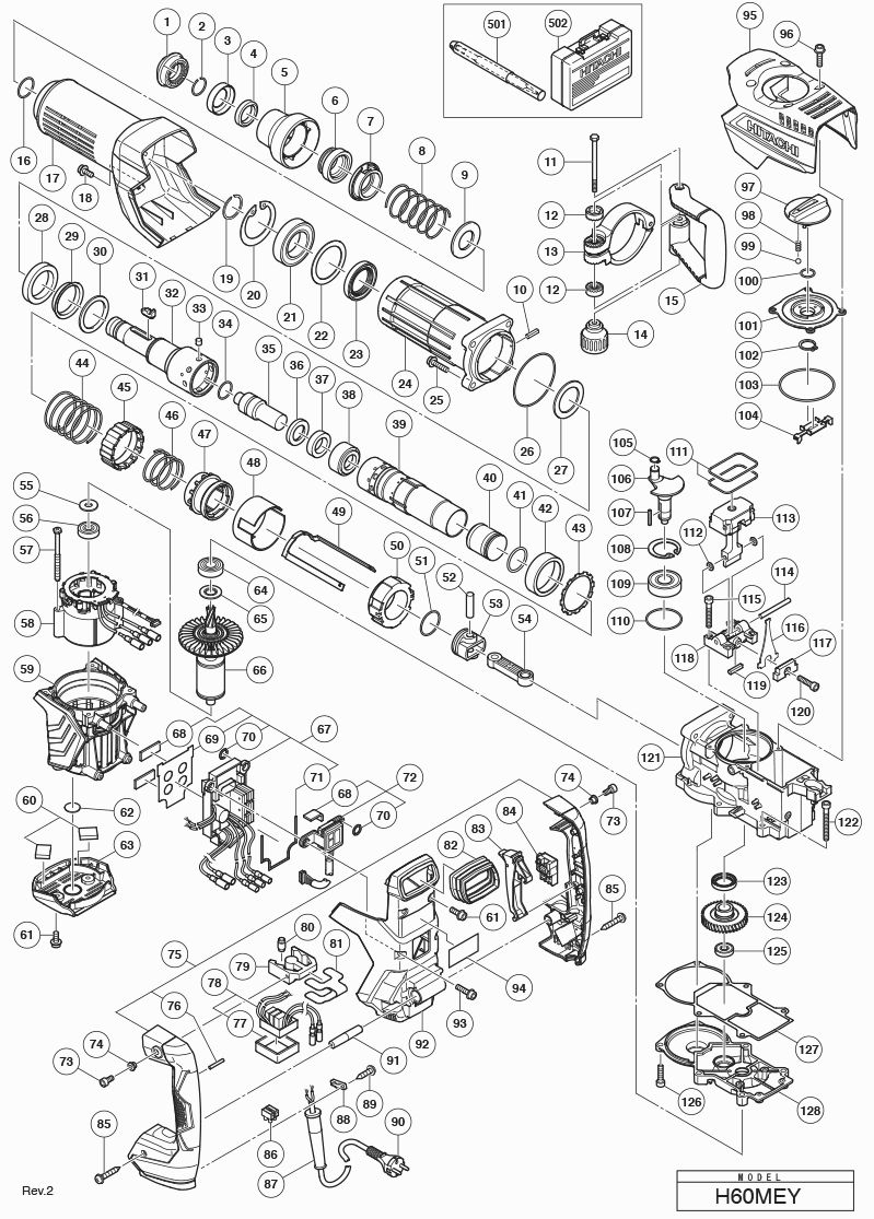 Hier vindt u alle beschikbare onderdelen en tekeningen van de 'Hikoki H60MEY'. Vanaf hier kunt u direct alle gewenste onderdelen bestellen. Vele onderdelen moeten bij de fabrikant besteld worden, dit duurt afhankelijk van het merk, één tot vier weken. Alle informatie die we hebben, staat op onze website, wij kunnen u geen advies geven over wat u nodig heeft, daarvoor zult u de machine ter reparatie in moeten leveren. Let bij het bestellen op het volgende: