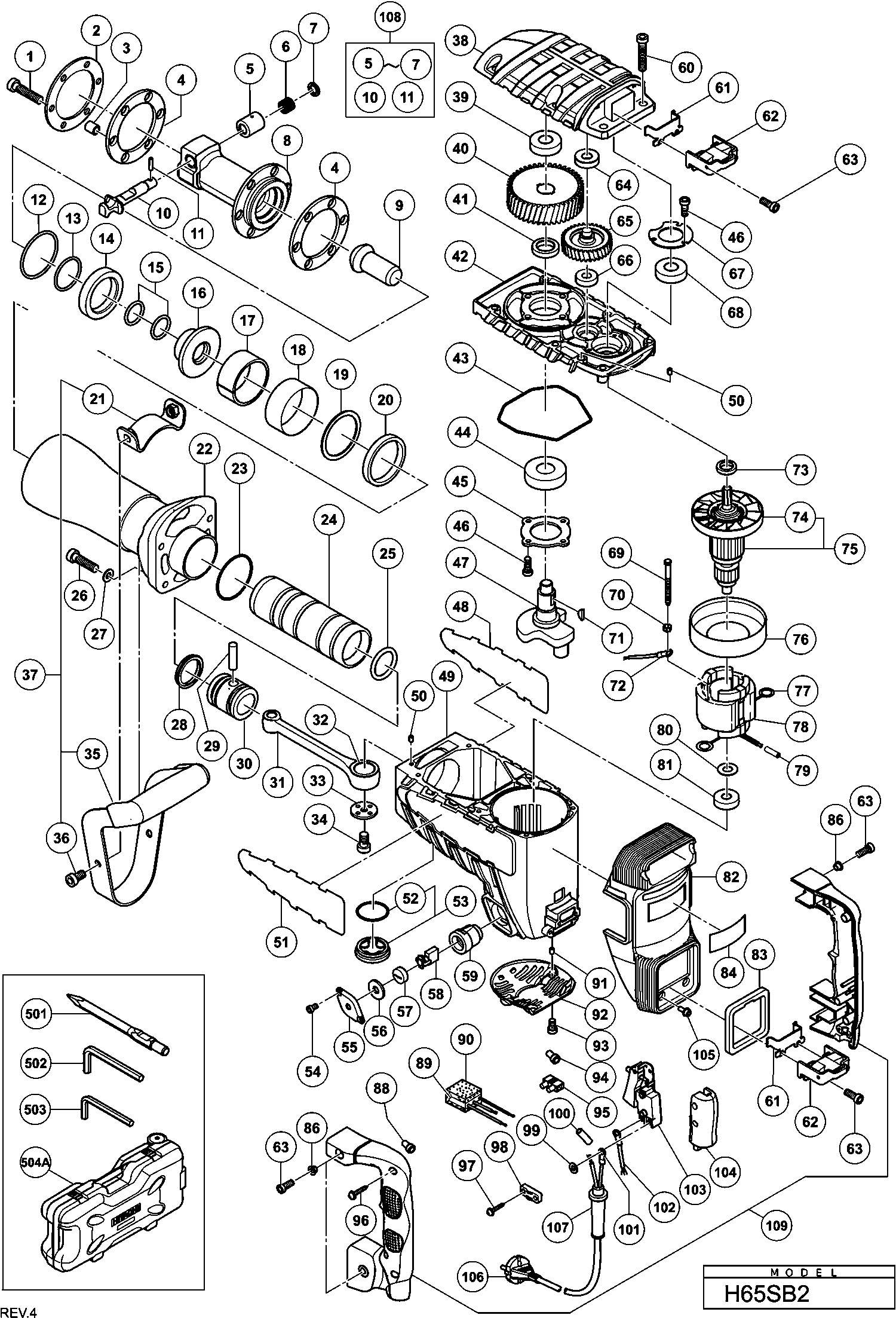 Hier vindt u alle beschikbare onderdelen en tekeningen van de 'Hikoki H65SB2'. Vanaf hier kunt u direct alle gewenste onderdelen bestellen. Vele onderdelen moeten bij de fabrikant besteld worden, dit duurt afhankelijk van het merk, één tot vier weken. Alle informatie die we hebben, staat op onze website, wij kunnen u geen advies geven over wat u nodig heeft, daarvoor zult u de machine ter reparatie in moeten leveren. Let bij het bestellen op het volgende: