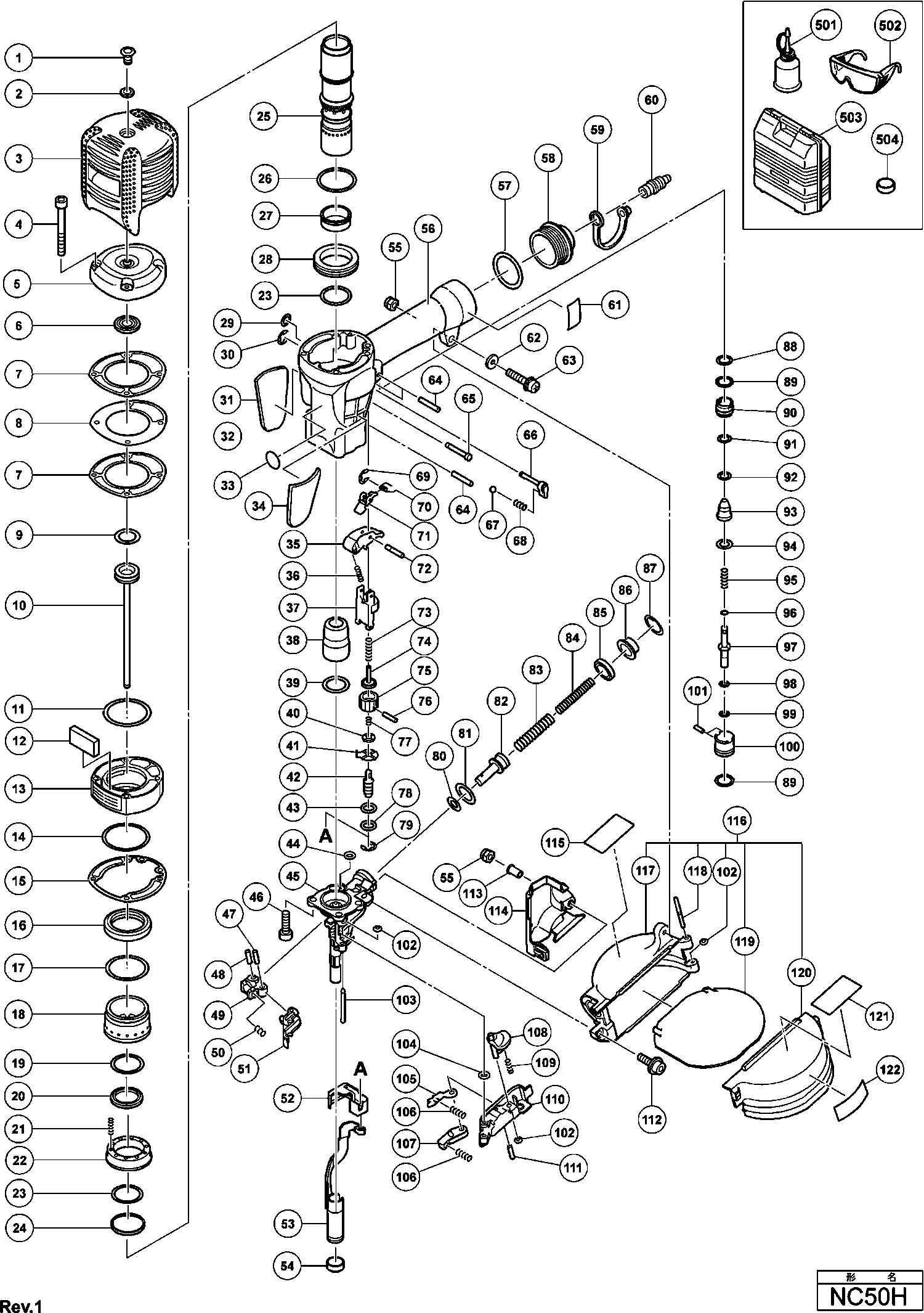 Hier vindt u alle beschikbare onderdelen en tekeningen van de 'Hikoki NC50H'. Vanaf hier kunt u direct alle gewenste onderdelen bestellen. Vele onderdelen moeten bij de fabrikant besteld worden, dit duurt afhankelijk van het merk, één tot vier weken. Alle informatie die we hebben, staat op onze website, wij kunnen u geen advies geven over wat u nodig heeft, daarvoor zult u de machine ter reparatie in moeten leveren. Let bij het bestellen op het volgende: