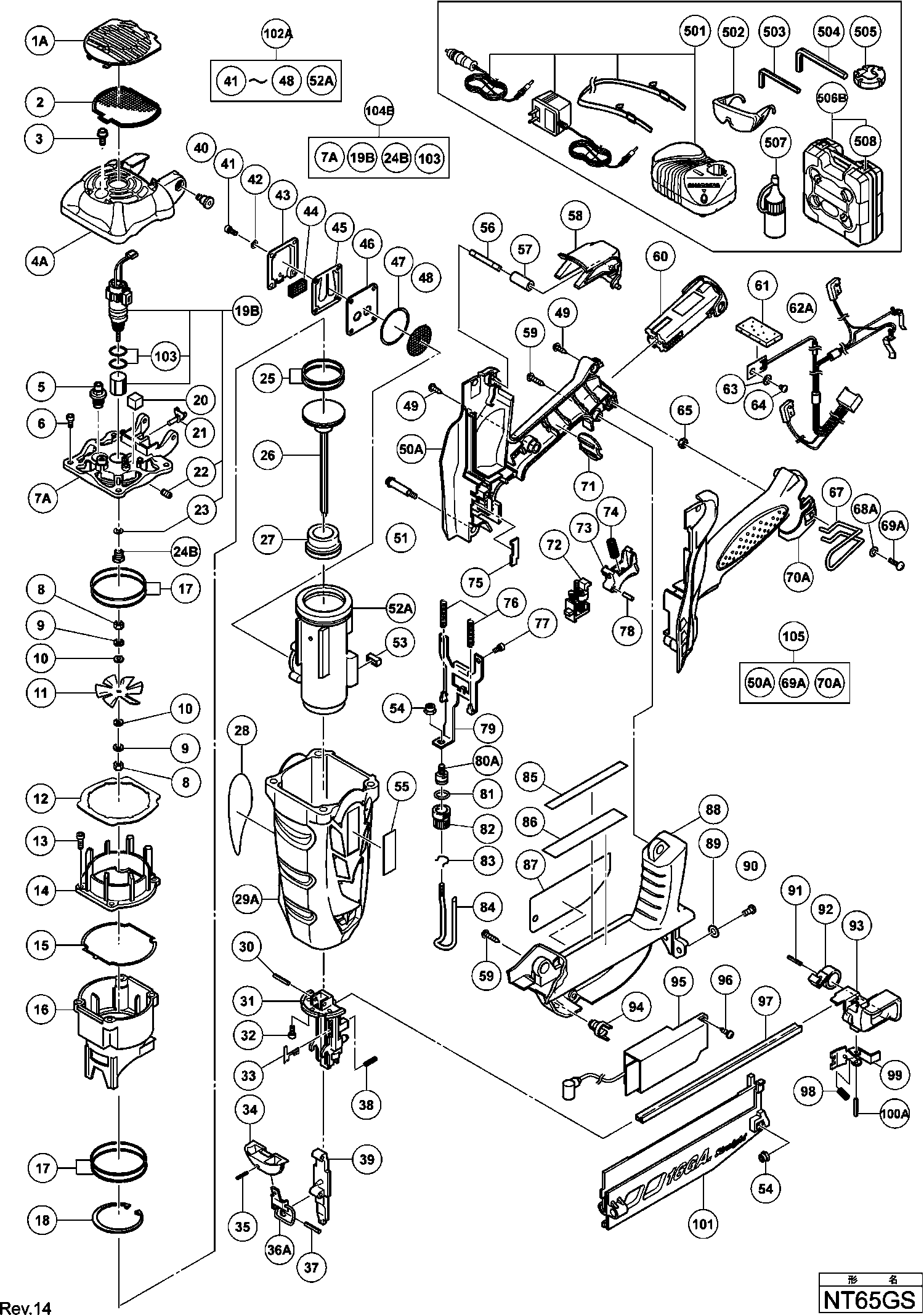Hier vindt u alle beschikbare onderdelen en tekeningen van de 'Hikoki NT65GS'. Vanaf hier kunt u direct alle gewenste onderdelen bestellen. Vele onderdelen moeten bij de fabrikant besteld worden, dit duurt afhankelijk van het merk, één tot vier weken. Alle informatie die we hebben, staat op onze website, wij kunnen u geen advies geven over wat u nodig heeft, daarvoor zult u de machine ter reparatie in moeten leveren. Let bij het bestellen op het volgende: