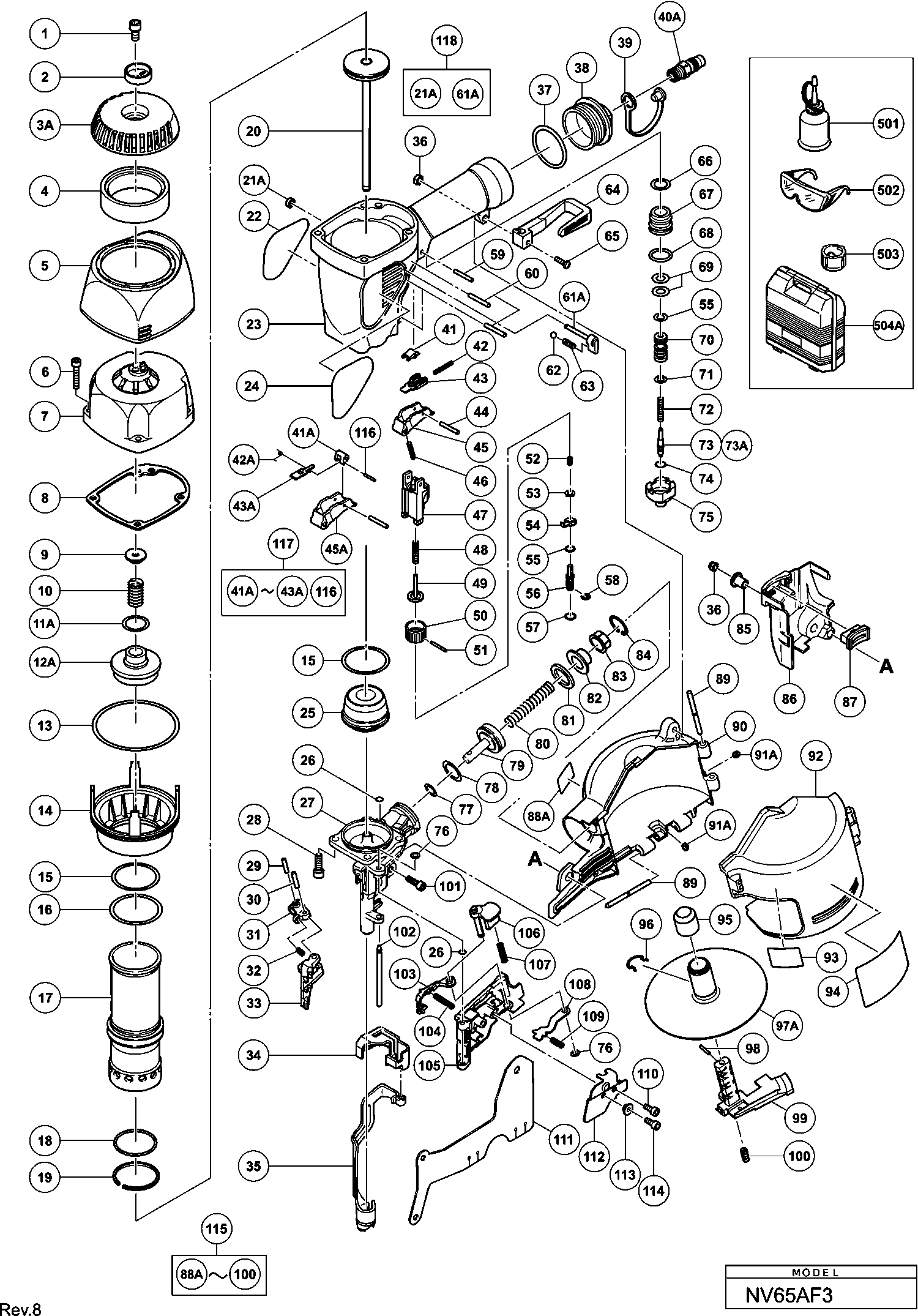 Hier vindt u alle beschikbare onderdelen en tekeningen van de 'Hikoki NV65AF3'. Vanaf hier kunt u direct alle gewenste onderdelen bestellen. Vele onderdelen moeten bij de fabrikant besteld worden, dit duurt afhankelijk van het merk, één tot vier weken. Alle informatie die we hebben, staat op onze website, wij kunnen u geen advies geven over wat u nodig heeft, daarvoor zult u de machine ter reparatie in moeten leveren. Let bij het bestellen op het volgende:
