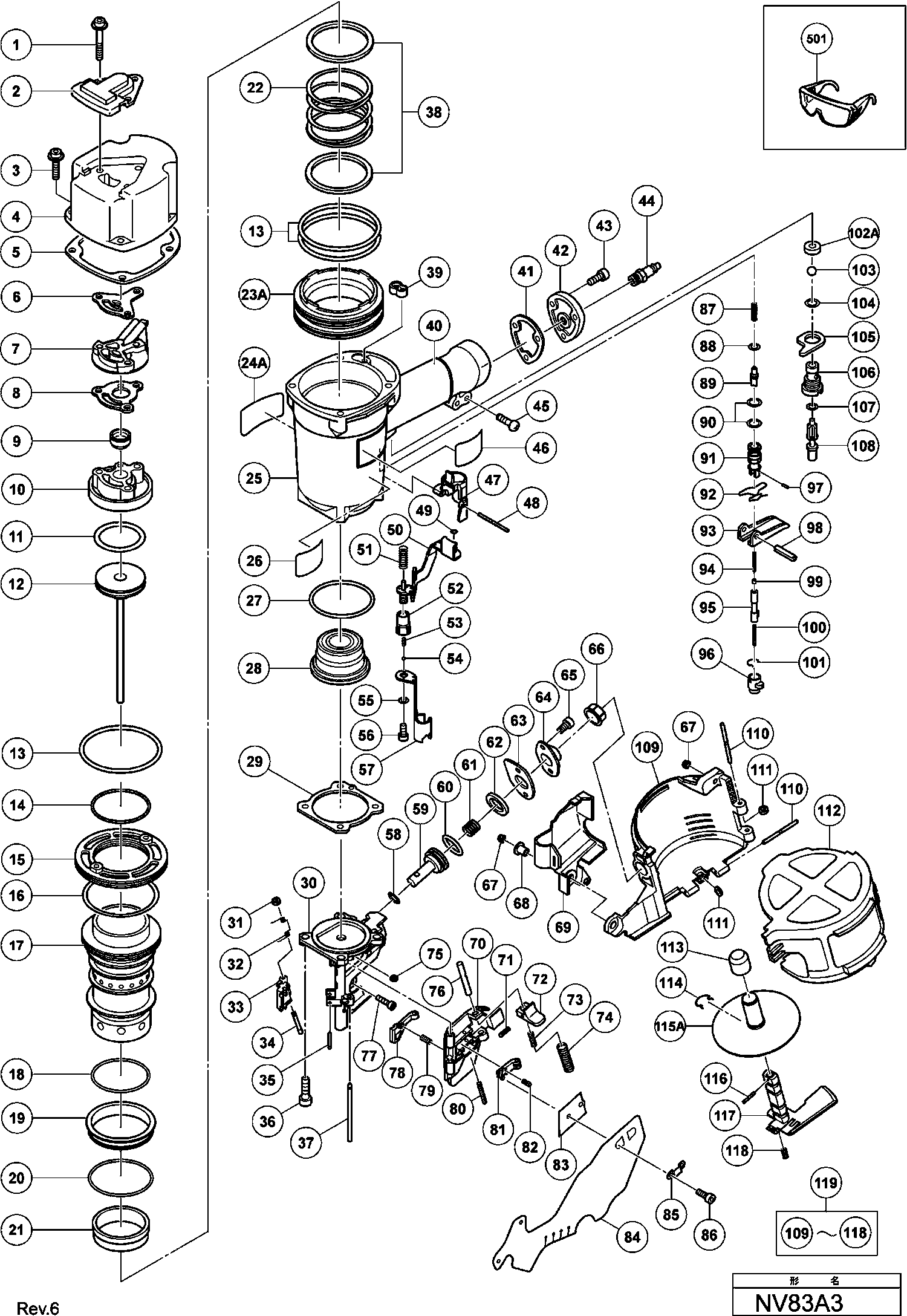Onderdelen lijst van de Hikoki NV83A3