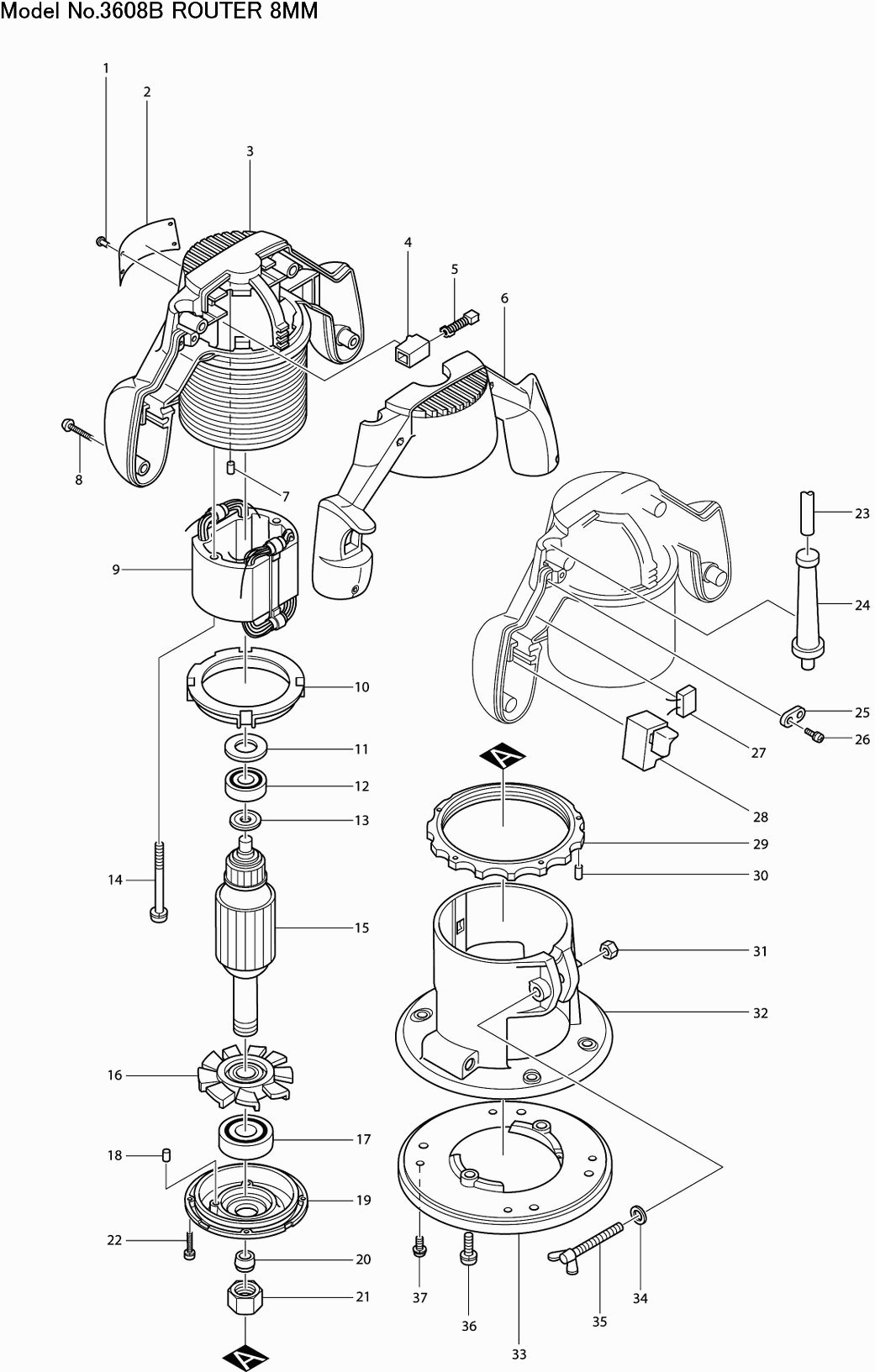 Hier vindt u alle beschikbare onderdelen en tekeningen van de 'Makita 3608B'. Vanaf hier kunt u direct alle gewenste onderdelen bestellen. Vele onderdelen moeten bij de fabrikant besteld worden, dit duurt afhankelijk van het merk, één tot vier weken. Alle informatie die we hebben, staat op onze website, wij kunnen u geen advies geven over wat u nodig heeft, daarvoor zult u de machine ter reparatie in moeten leveren. Let bij het bestellen op het volgende: