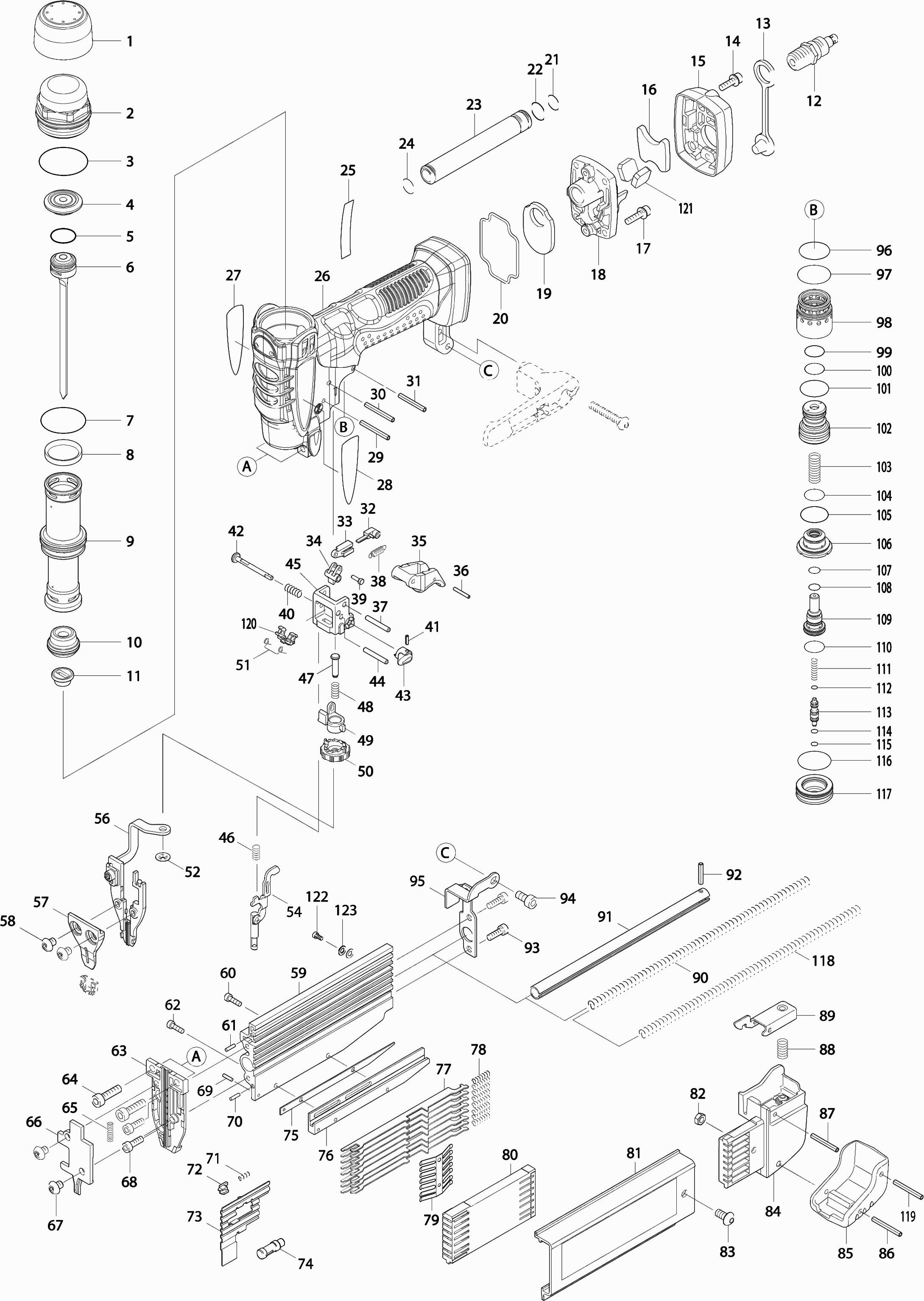 Hier vindt u alle beschikbare onderdelen en tekeningen van de 'Makita AF500HP'. Vanaf hier kunt u direct alle gewenste onderdelen bestellen. Vele onderdelen moeten bij de fabrikant besteld worden, dit duurt afhankelijk van het merk, één tot vier weken. Alle informatie die we hebben, staat op onze website, wij kunnen u geen advies geven over wat u nodig heeft, daarvoor zult u de machine ter reparatie in moeten leveren. Let bij het bestellen op het volgende: