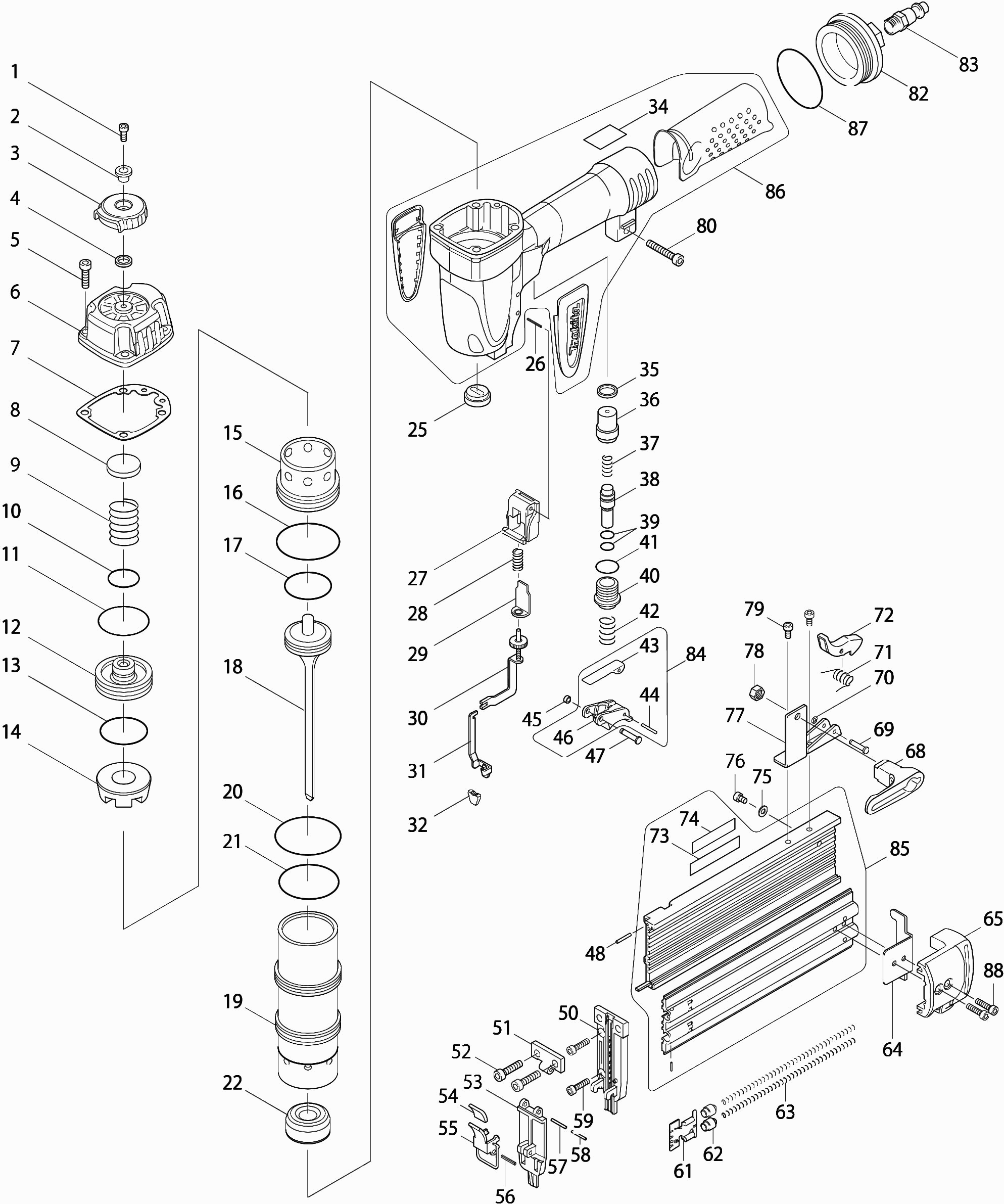 Hier vindt u alle beschikbare onderdelen en tekeningen van de 'Makita AF505N'. Vanaf hier kunt u direct alle gewenste onderdelen bestellen. Vele onderdelen moeten bij de fabrikant besteld worden, dit duurt afhankelijk van het merk, één tot vier weken. Alle informatie die we hebben, staat op onze website, wij kunnen u geen advies geven over wat u nodig heeft, daarvoor zult u de machine ter reparatie in moeten leveren. Let bij het bestellen op het volgende: