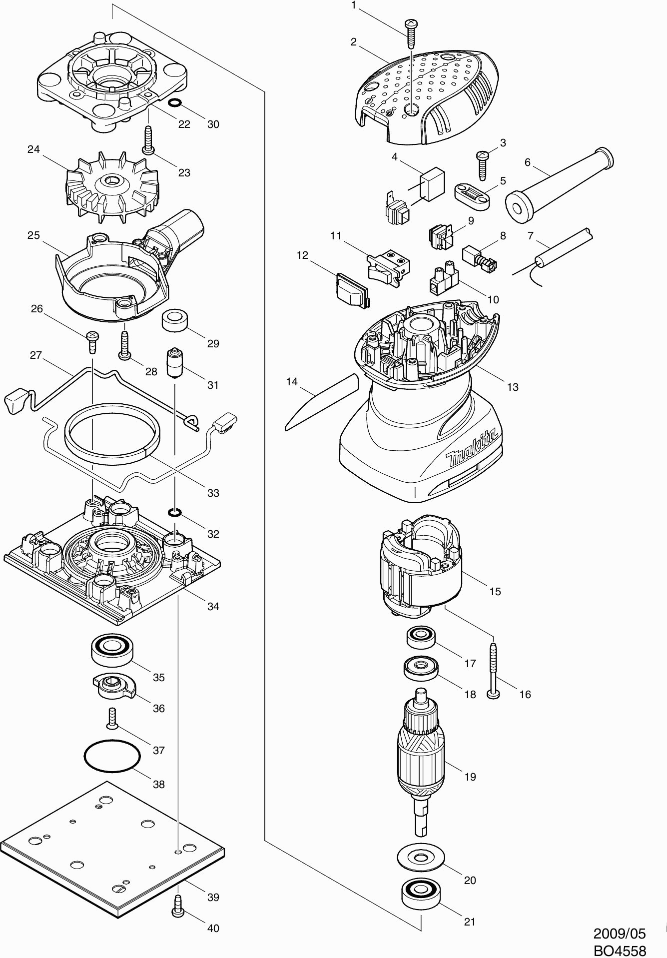 Hier vindt u alle beschikbare onderdelen en tekeningen van de 'Makita BO4558'. Vanaf hier kunt u direct alle gewenste onderdelen bestellen. Vele onderdelen moeten bij de fabrikant besteld worden, dit duurt afhankelijk van het merk, één tot vier weken. Alle informatie die we hebben, staat op onze website, wij kunnen u geen advies geven over wat u nodig heeft, daarvoor zult u de machine ter reparatie in moeten leveren. Let bij het bestellen op het volgende: