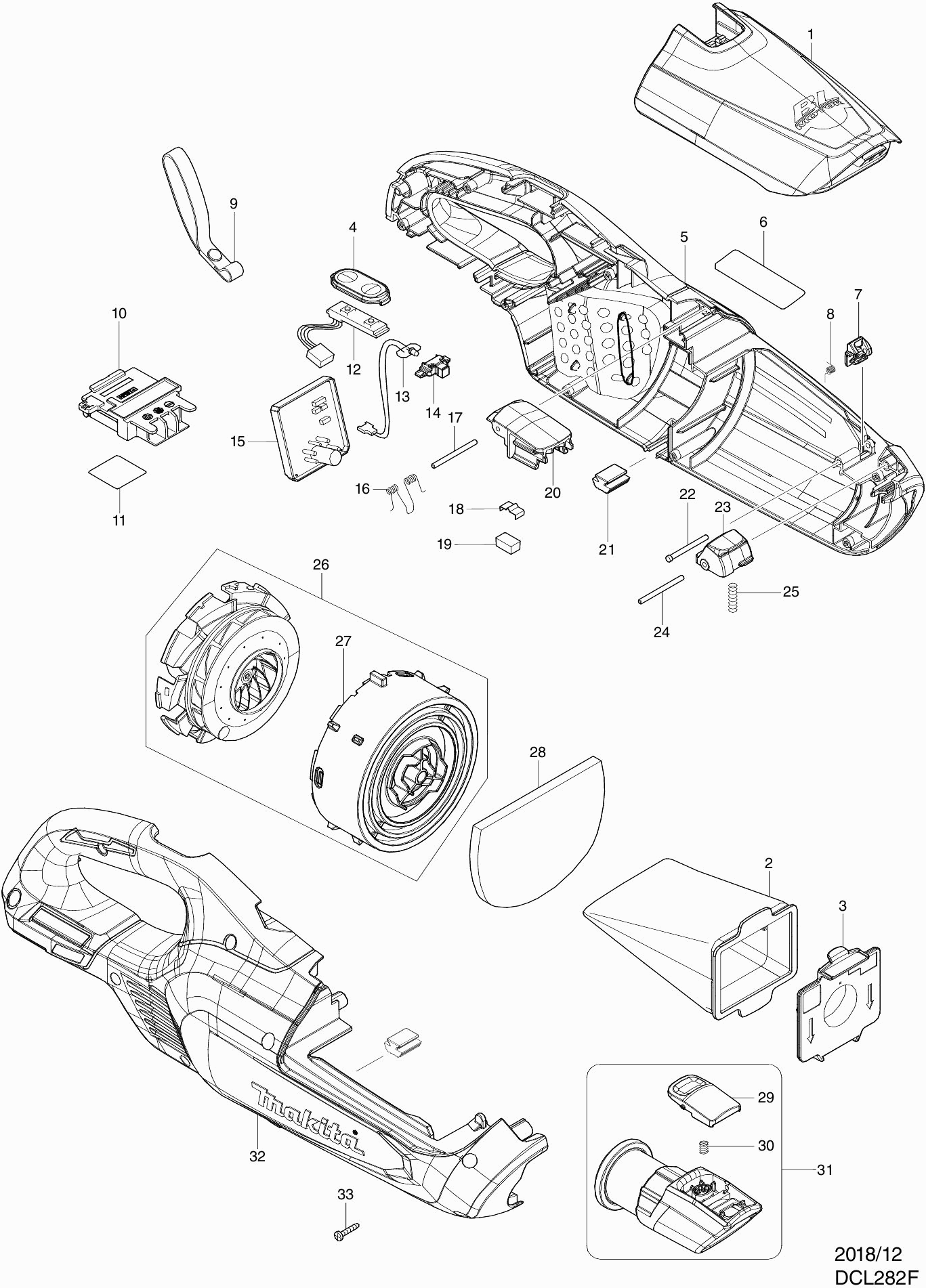 Onderdelen lijst van de Makita DCL282F