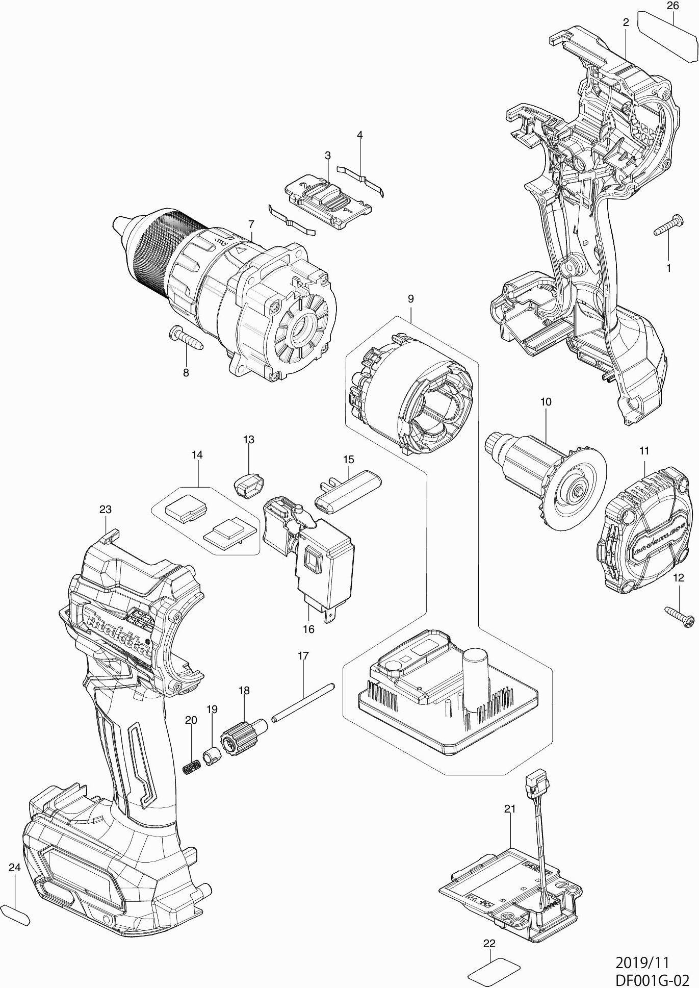 Onderdelen lijst van de Makita DF001G