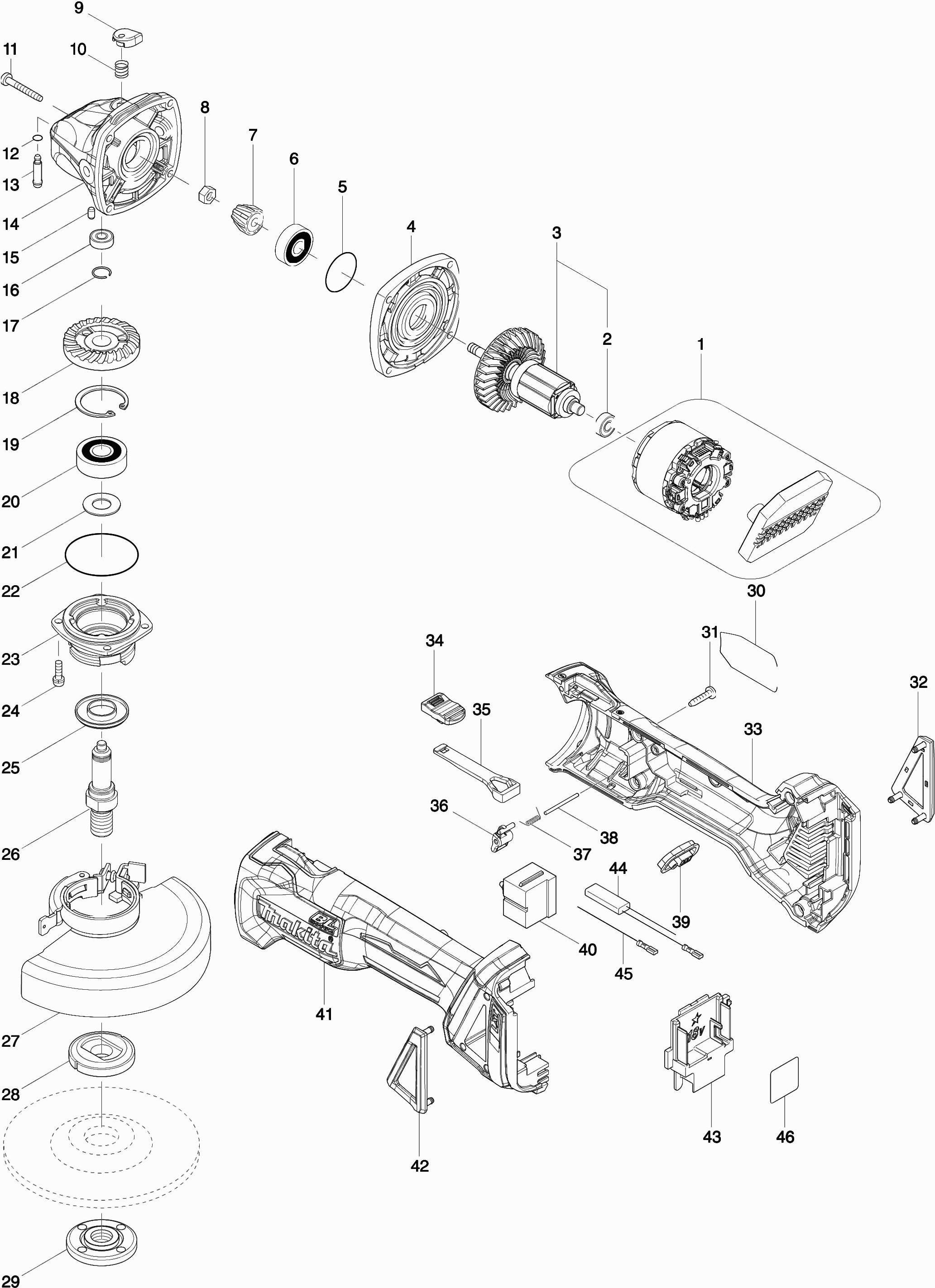 Onderdelen lijst van de Makita DGA504