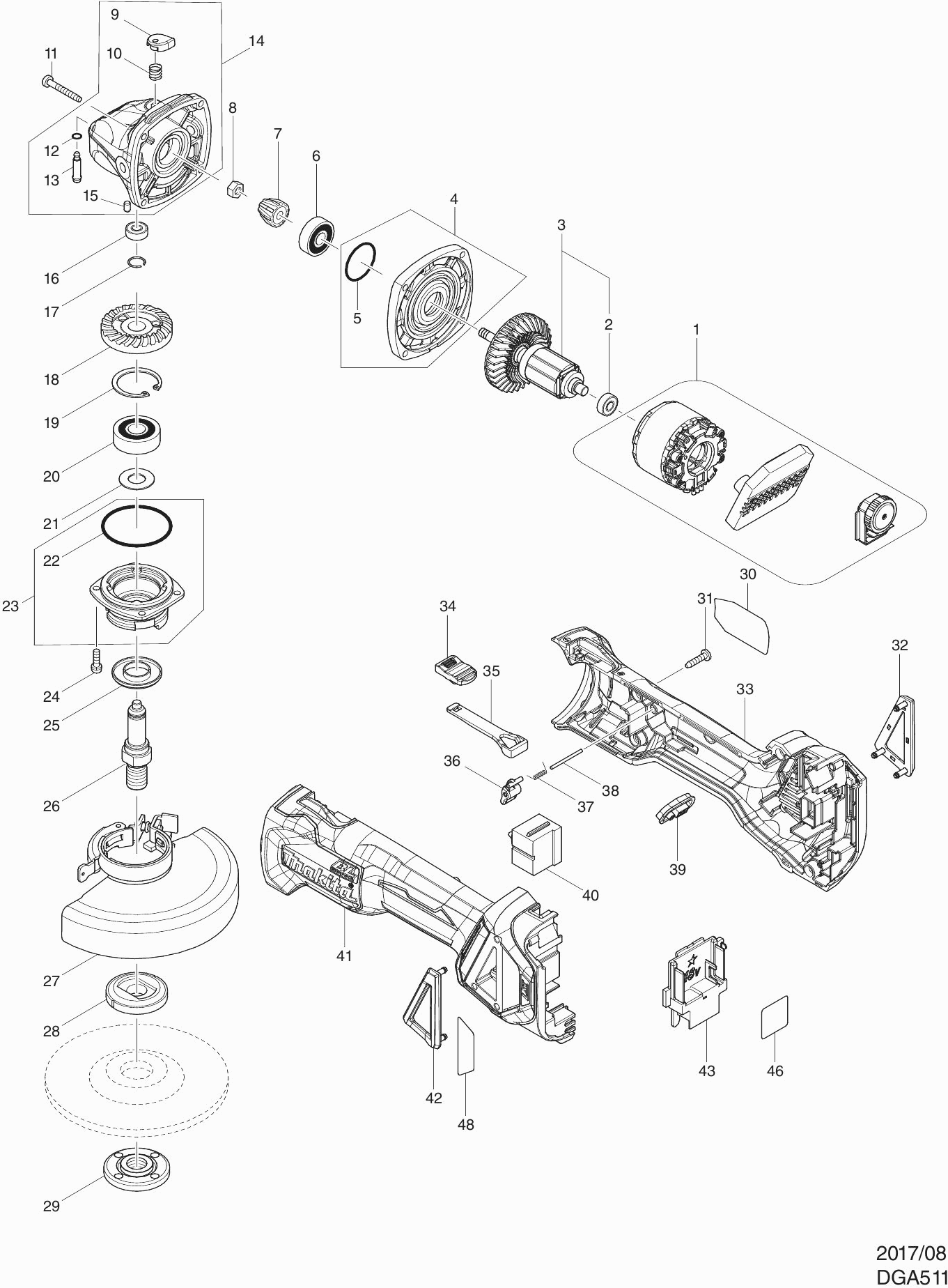 Onderdelen lijst van de Makita DGA511