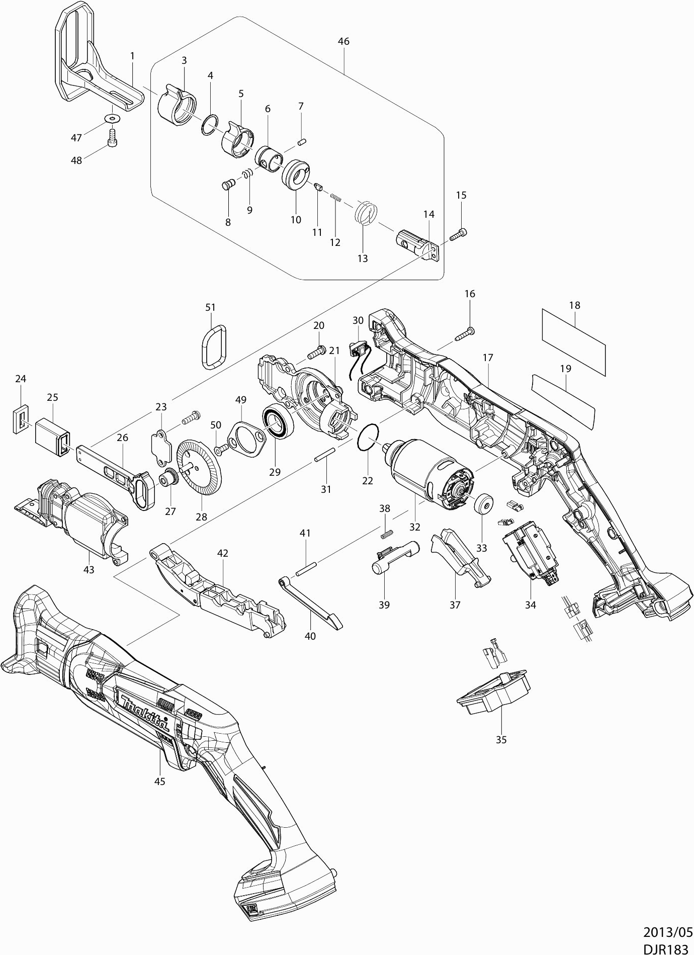 Onderdelen lijst van de Makita DJR183