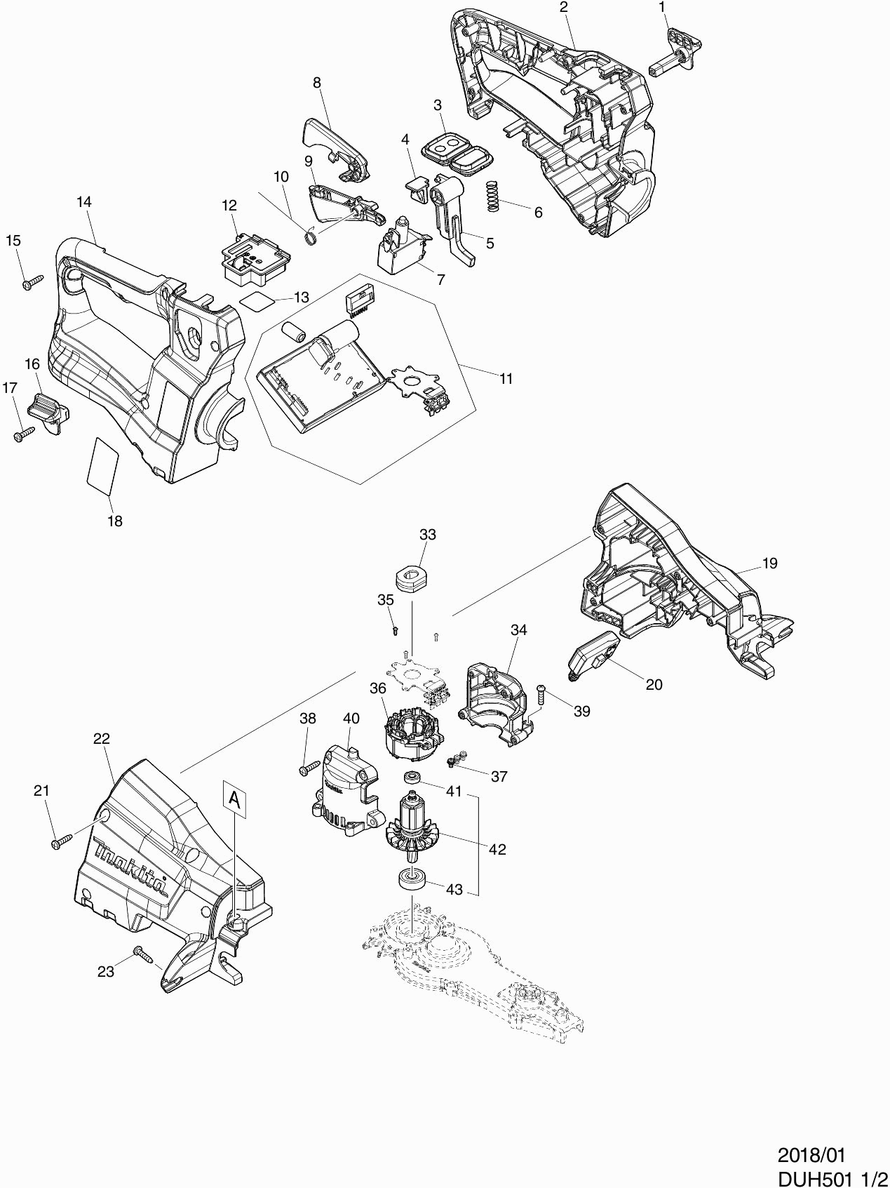 Hier vindt u alle beschikbare onderdelen en tekeningen van de 'Makita DUH501Z'. Vanaf hier kunt u direct alle gewenste onderdelen bestellen. Vele onderdelen moeten bij de fabrikant besteld worden, dit duurt afhankelijk van het merk, één tot vier weken. Alle informatie die we hebben, staat op onze website, wij kunnen u geen advies geven over wat u nodig heeft, daarvoor zult u de machine ter reparatie in moeten leveren. Let bij het bestellen op het volgende: