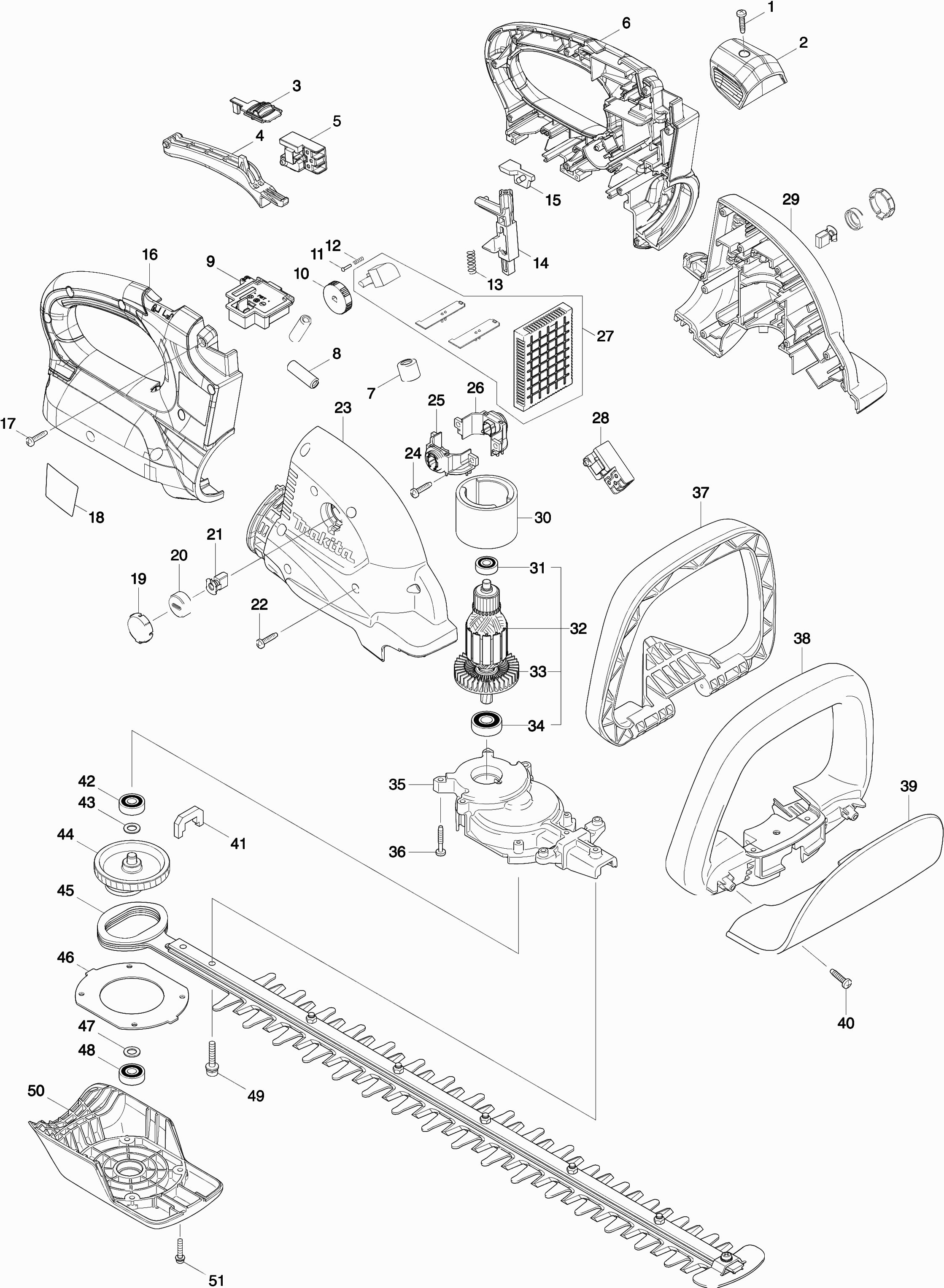 Hier vindt u alle beschikbare onderdelen en tekeningen van de 'Makita DUH551'. Vanaf hier kunt u direct alle gewenste onderdelen bestellen. Vele onderdelen moeten bij de fabrikant besteld worden, dit duurt afhankelijk van het merk, één tot vier weken. Alle informatie die we hebben, staat op onze website, wij kunnen u geen advies geven over wat u nodig heeft, daarvoor zult u de machine ter reparatie in moeten leveren. Let bij het bestellen op het volgende: