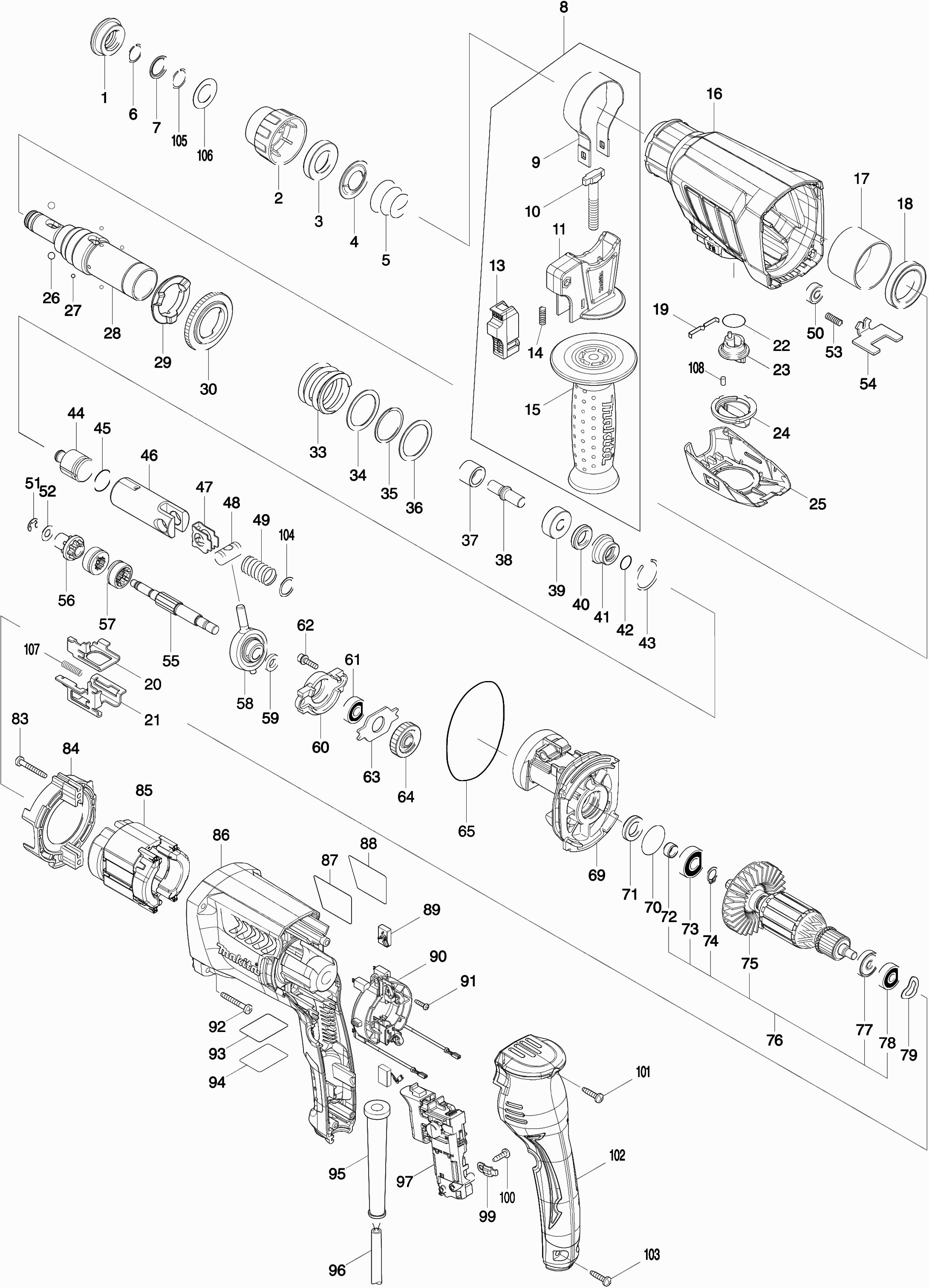 Hier vindt u alle beschikbare onderdelen en tekeningen van de 'Makita HR2630'. Vanaf hier kunt u direct alle gewenste onderdelen bestellen. Vele onderdelen moeten bij de fabrikant besteld worden, dit duurt afhankelijk van het merk, één tot vier weken. Alle informatie die we hebben, staat op onze website, wij kunnen u geen advies geven over wat u nodig heeft, daarvoor zult u de machine ter reparatie in moeten leveren. Let bij het bestellen op het volgende: