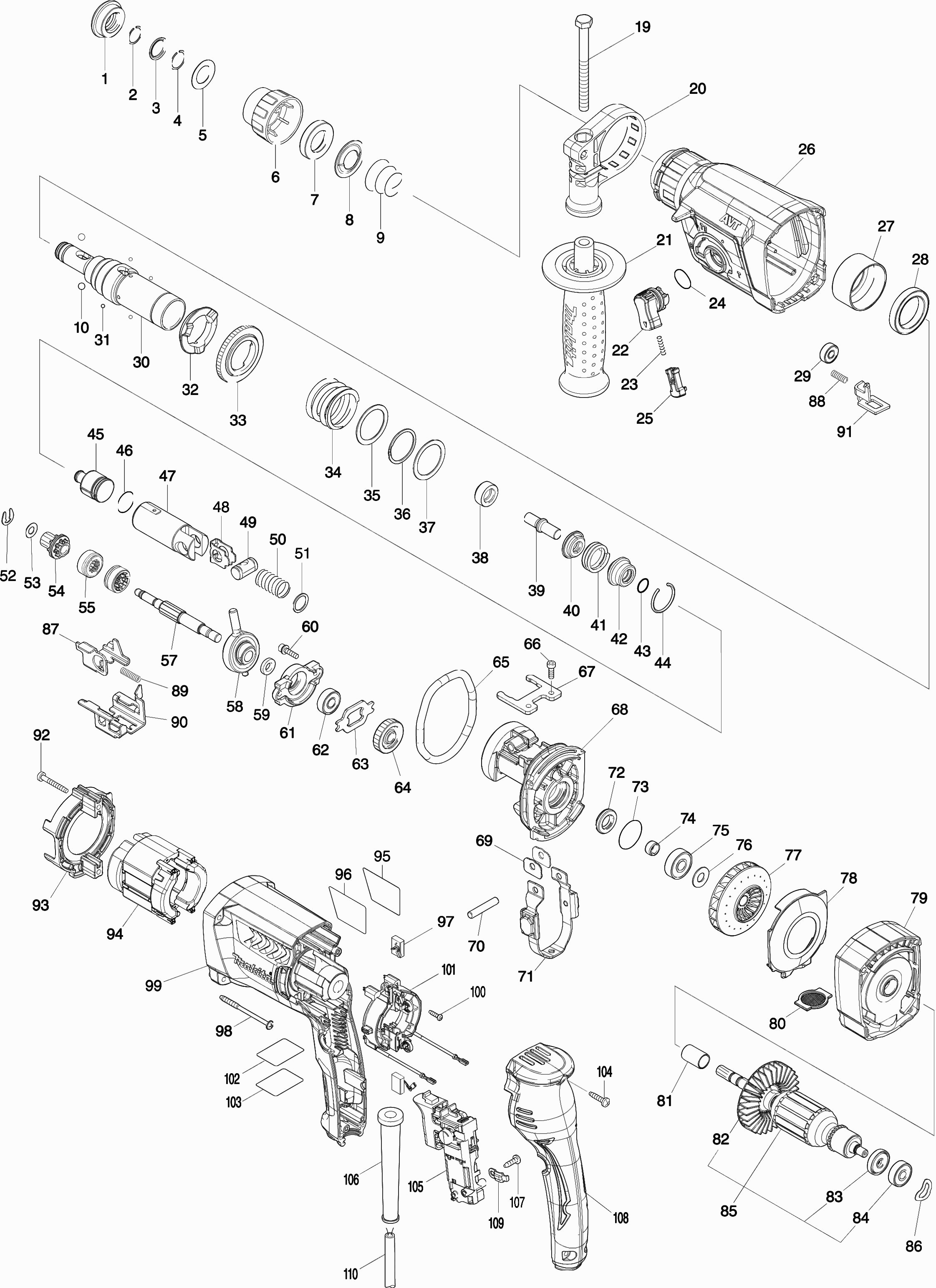 Hier vindt u alle beschikbare onderdelen en tekeningen van de 'Makita HR2651'. Vanaf hier kunt u direct alle gewenste onderdelen bestellen. Vele onderdelen moeten bij de fabrikant besteld worden, dit duurt afhankelijk van het merk, één tot vier weken. Alle informatie die we hebben, staat op onze website, wij kunnen u geen advies geven over wat u nodig heeft, daarvoor zult u de machine ter reparatie in moeten leveren. Let bij het bestellen op het volgende:
