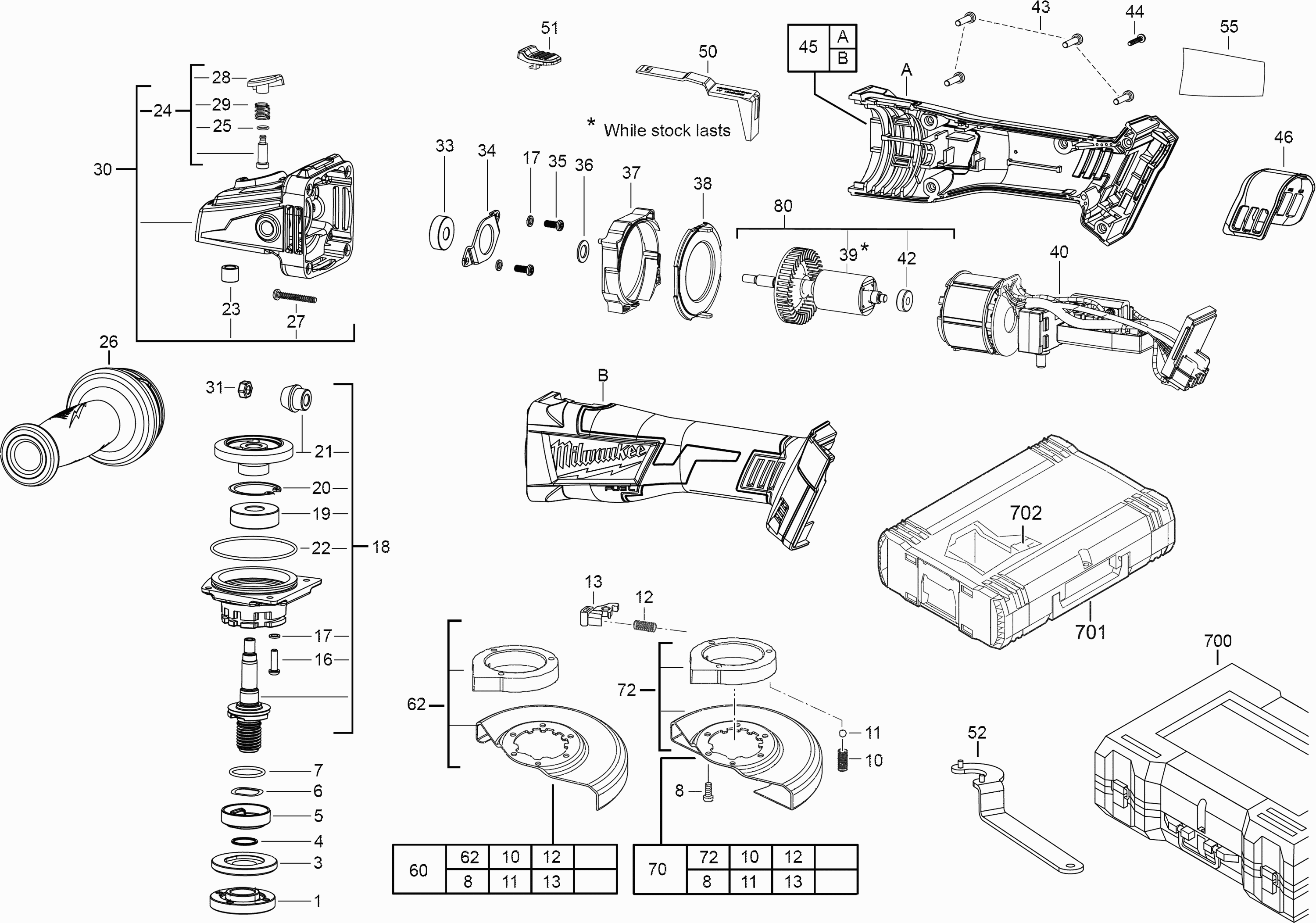 Hier vindt u alle beschikbare onderdelen en tekeningen van de 'Milwaukee 4000458504 ( M18CAG125X0 )'. Vanaf hier kunt u direct alle gewenste onderdelen bestellen. Vele onderdelen moeten bij de fabrikant besteld worden, dit duurt afhankelijk van het merk, één tot vier weken. Alle informatie die we hebben, staat op onze website, wij kunnen u geen advies geven over wat u nodig heeft, daarvoor zult u de machine ter reparatie in moeten leveren. Let bij het bestellen op het volgende:
