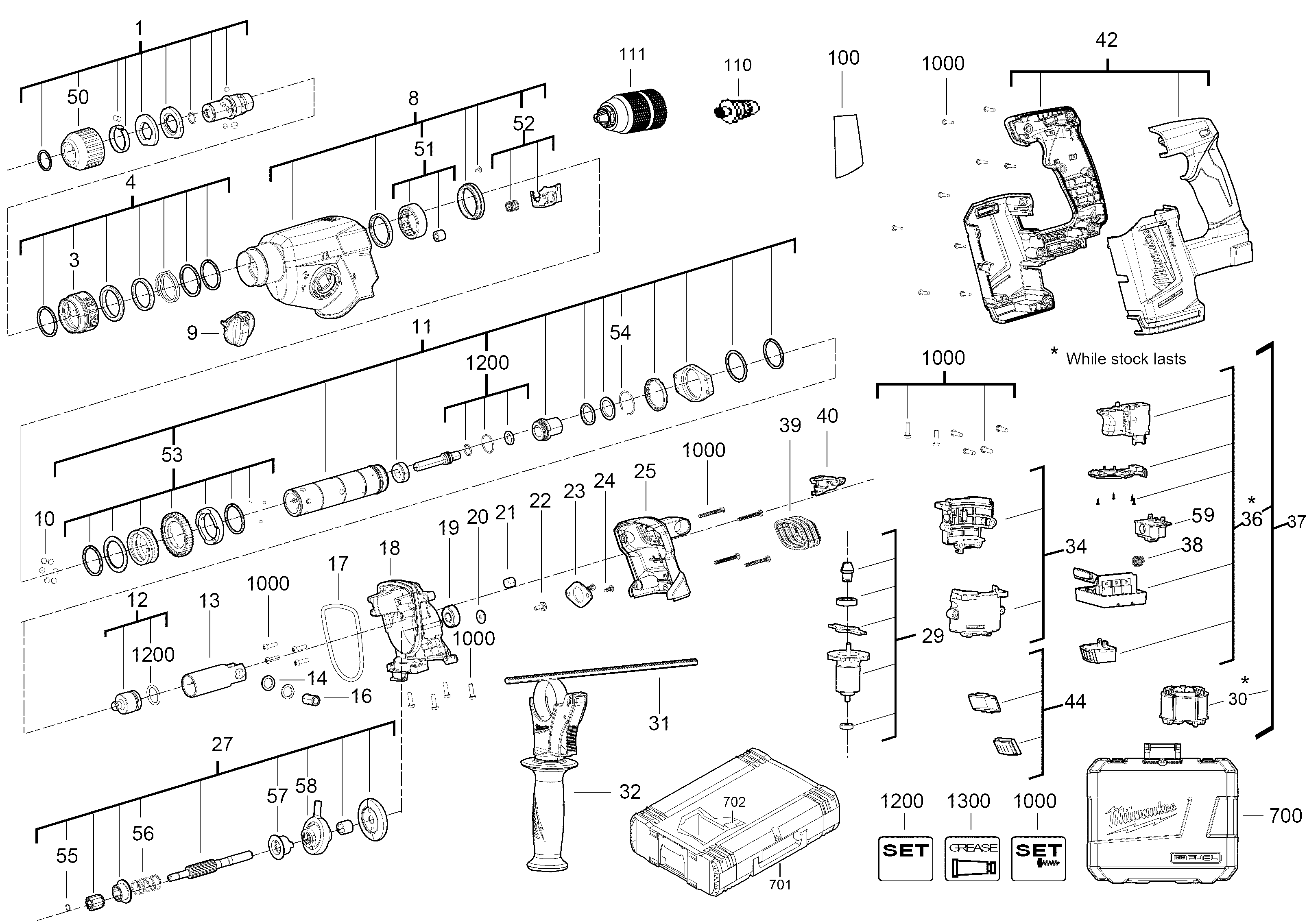 Hier vindt u alle beschikbare onderdelen en tekeningen van de 'Milwaukee 4000447421 ( M18CHX-0 )'. Vanaf hier kunt u direct alle gewenste onderdelen bestellen. Vele onderdelen moeten bij de fabrikant besteld worden, dit duurt afhankelijk van het merk, één tot vier weken. Alle informatie die we hebben, staat op onze website, wij kunnen u geen advies geven over wat u nodig heeft, daarvoor zult u de machine ter reparatie in moeten leveren. Let bij het bestellen op het volgende: