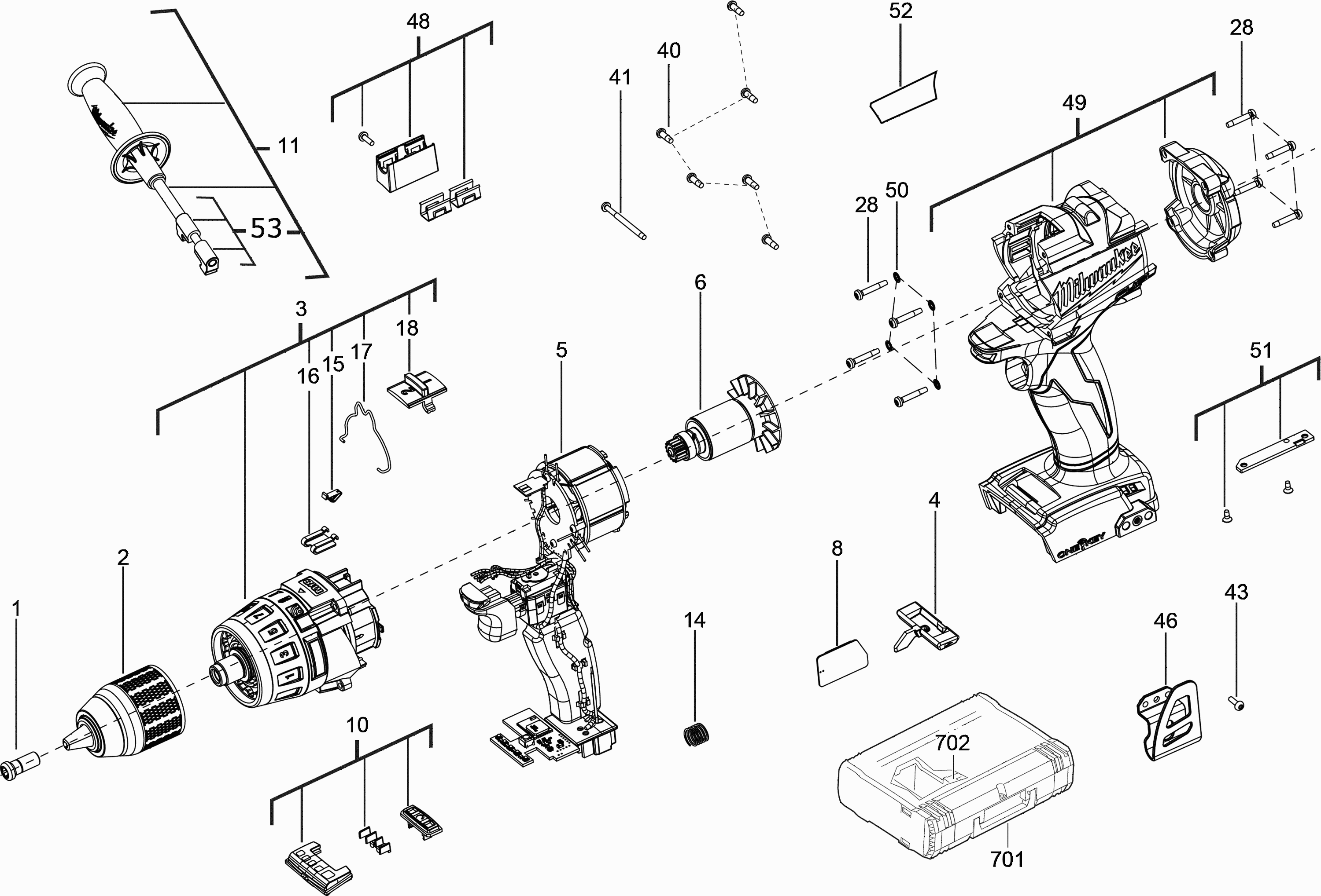 Hier vindt u alle beschikbare onderdelen en tekeningen van de 'Milwaukee 4000452724 ( M18ONEDD-0 )'. Vanaf hier kunt u direct alle gewenste onderdelen bestellen. Vele onderdelen moeten bij de fabrikant besteld worden, dit duurt afhankelijk van het merk, één tot vier weken. Alle informatie die we hebben, staat op onze website, wij kunnen u geen advies geven over wat u nodig heeft, daarvoor zult u de machine ter reparatie in moeten leveren. Let bij het bestellen op het volgende: