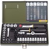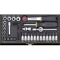 Proxxon fijnmachanica doppenset 36 delig in zeer stabiele gelaste stalen kist, duurzaam gemoffeld. Met sterk kunststof interieur. met 1/4'' ratel. Doppen van 4mm tot 13mm. Schroefbit met vierkantopname voor sleuf schroeven, kruiskopschroeven, torx schroeven en binnenzeskantdoppen. Tevens 5 inbussleutels (haaks) Gr. 1,25 - 1,5 - 2,0 - 2,5 en 3,0mm. Voor overige inhoud zie afbeelding.