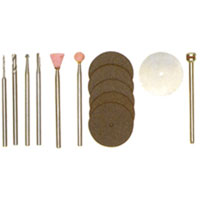 Modelbouwset, 13 dlg. Voor zagen, doorslijpen, frezen, polijsten en boren. Elk 1 fijnfrees kogelvorm 2,3 mm, cilindervorm 2,3 mm, elk 1 edelkorund slijpstift kogelvorm 5,0 mm en conusvorm 5,0 mm, elk 1 microboor 1,0 mm en 2,3 mm, 5 doorslijp¬schijven Ø 22 mm, 1 cirkelzaagblad Ø 22 mm en 1 houder Ø 2,35 mm.